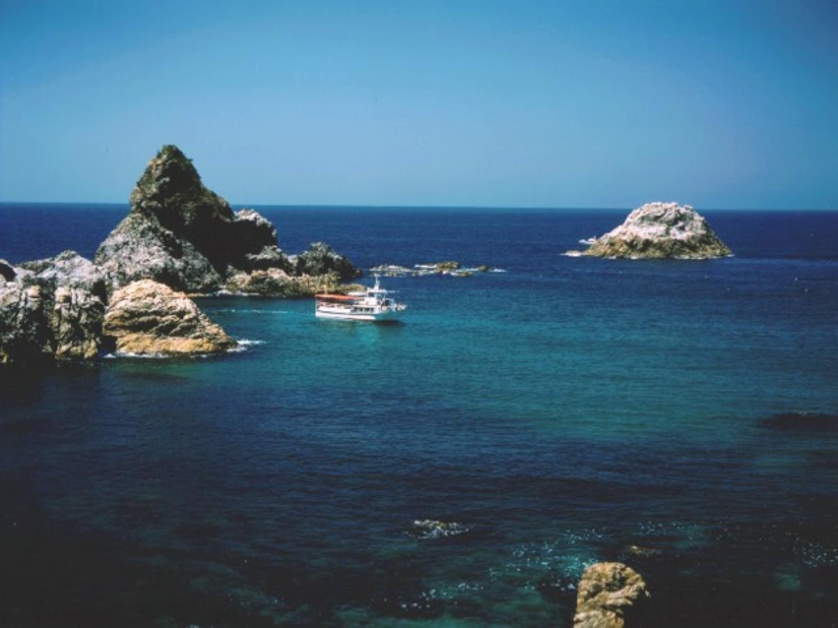 一周約40分の笹川流れ周遊コースをおばこ丸が就航。眼鏡岩・恐竜岩・鷹ノ巣岩・びょうぶ岩などの奇岩を間近に巡り、潮風を感じながらカモメの餌付け体験(エサ100円)も楽しめます。