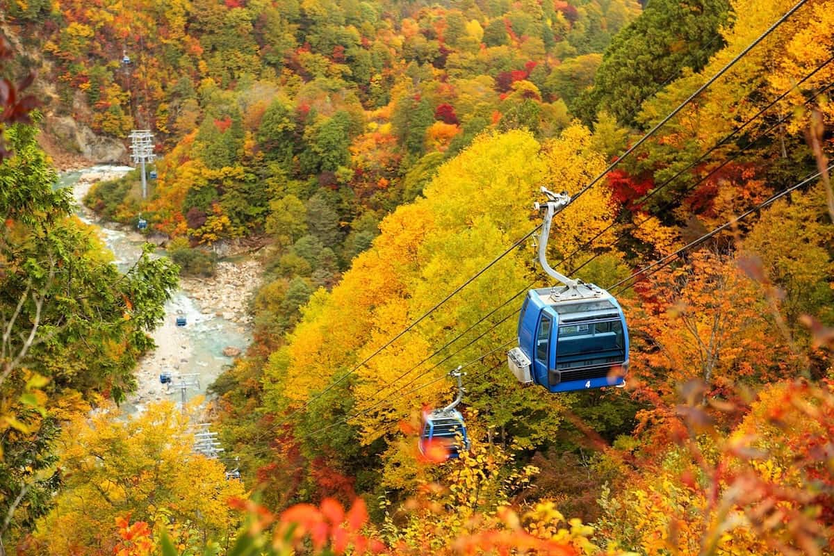 一番の絶景ポイントと呼ばれる14号柱付近では、まるで紅葉の中に飛び込んで行くような急降下を体感できます。鮮やかに色づいた錦秋の山々は圧巻!