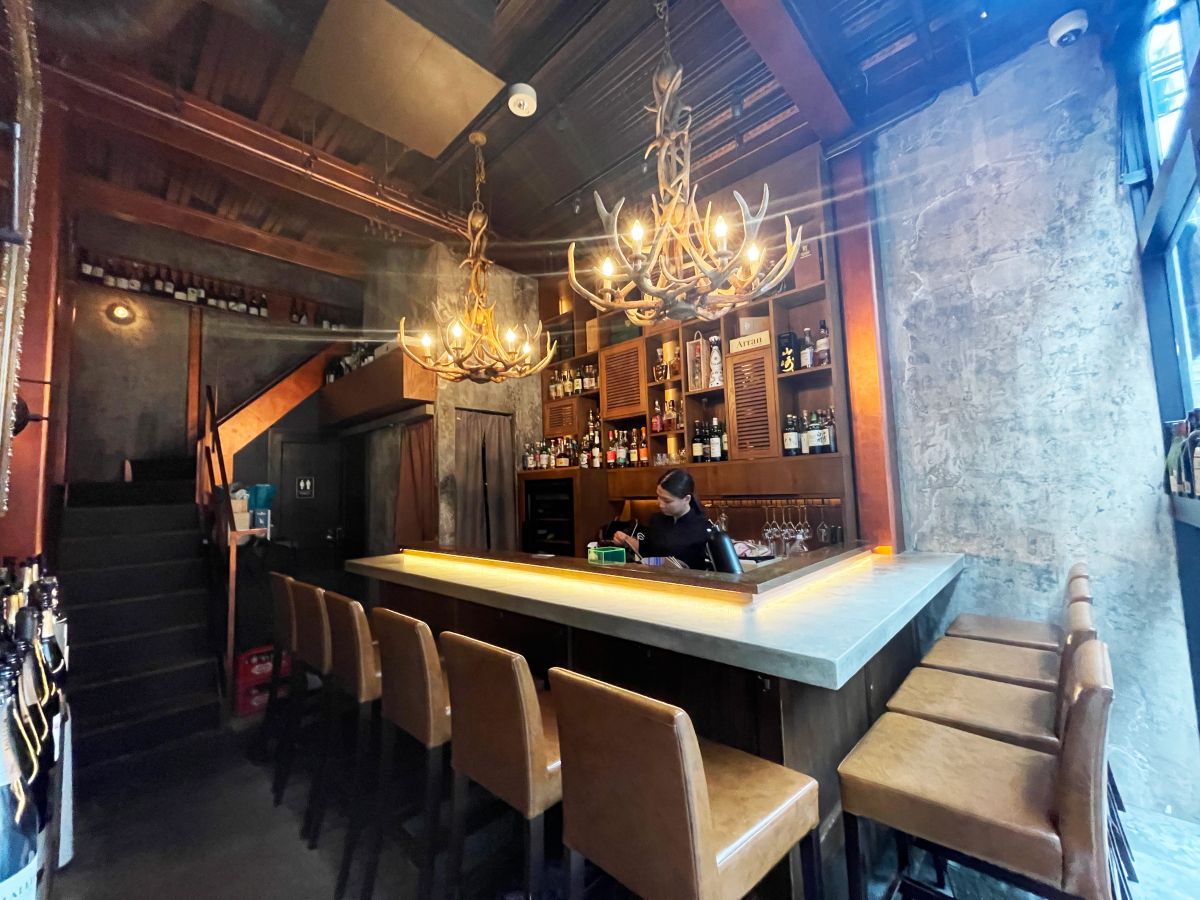 JR恵比寿駅から徒歩5分。裏路地を進むと、ガラス張りのおしゃれなバー「parfait AUNN」があります。