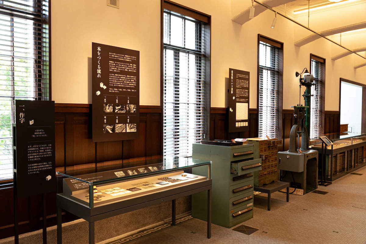 1階で活版印刷による本作りの流れを見ていきます。まずは【作字】という作業。1文字ずつ手描きで原図を作成して、活字の型となる母型を機械で彫刻するところから始まります。書体は大日本印刷の前身、秀英舎時代に開発されたオリジナルの秀英体。現在はデジタル化され、紙の本はもちろん、電子書籍やWEBでも幅広く使われています。