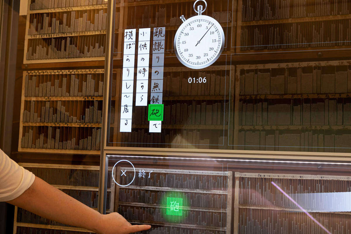 職人気分で「文選」を体験できるコーナーを発見。お題は、夏目漱石の小説『坊ちゃん』の冒頭の活字(22文字)を探すこと。見つけたら透明モニターをタッチし、2分間で何文字拾えるかをゲーム感覚で楽しめます。