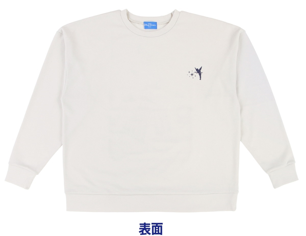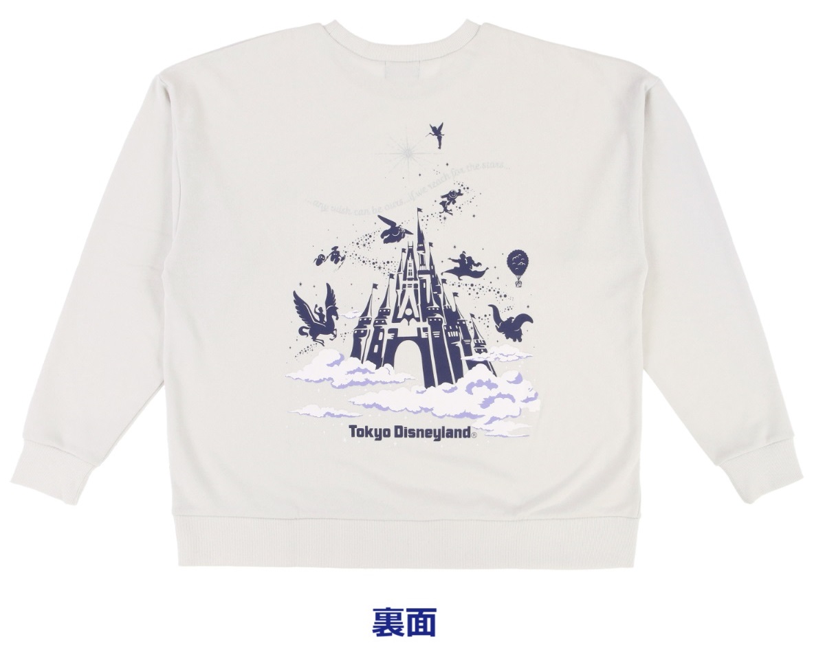 バックにシンデレラ城とキャラクターたちがデザインされたトレーナー。全面の胸元にはティンカー・ベルのシルエットも。