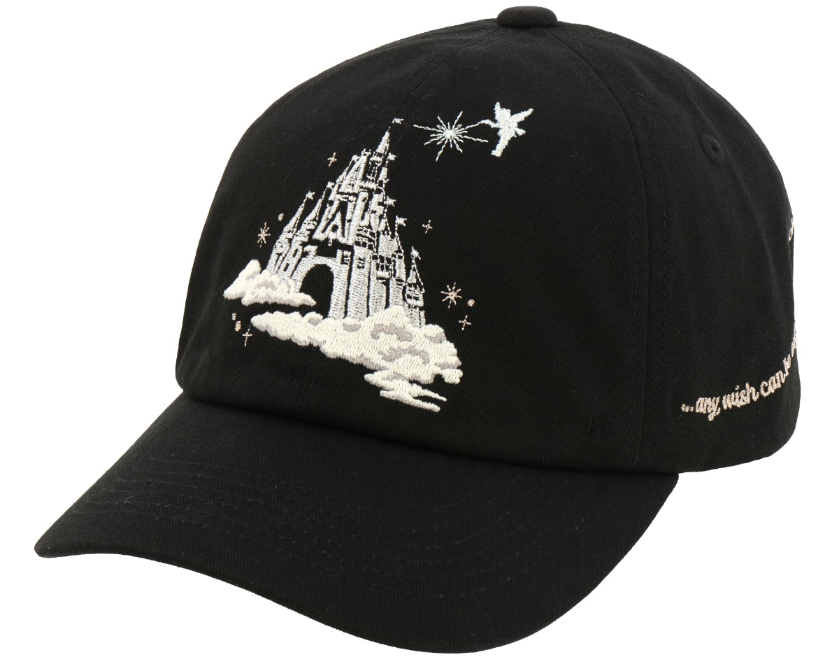 シンデレラ城とティンカー・ベルのシルエットがデザインされた黒がベースのキャップ。渋めでおすすめ。アジャスター部分にTOKYO DISNEYLANDの文字入り。