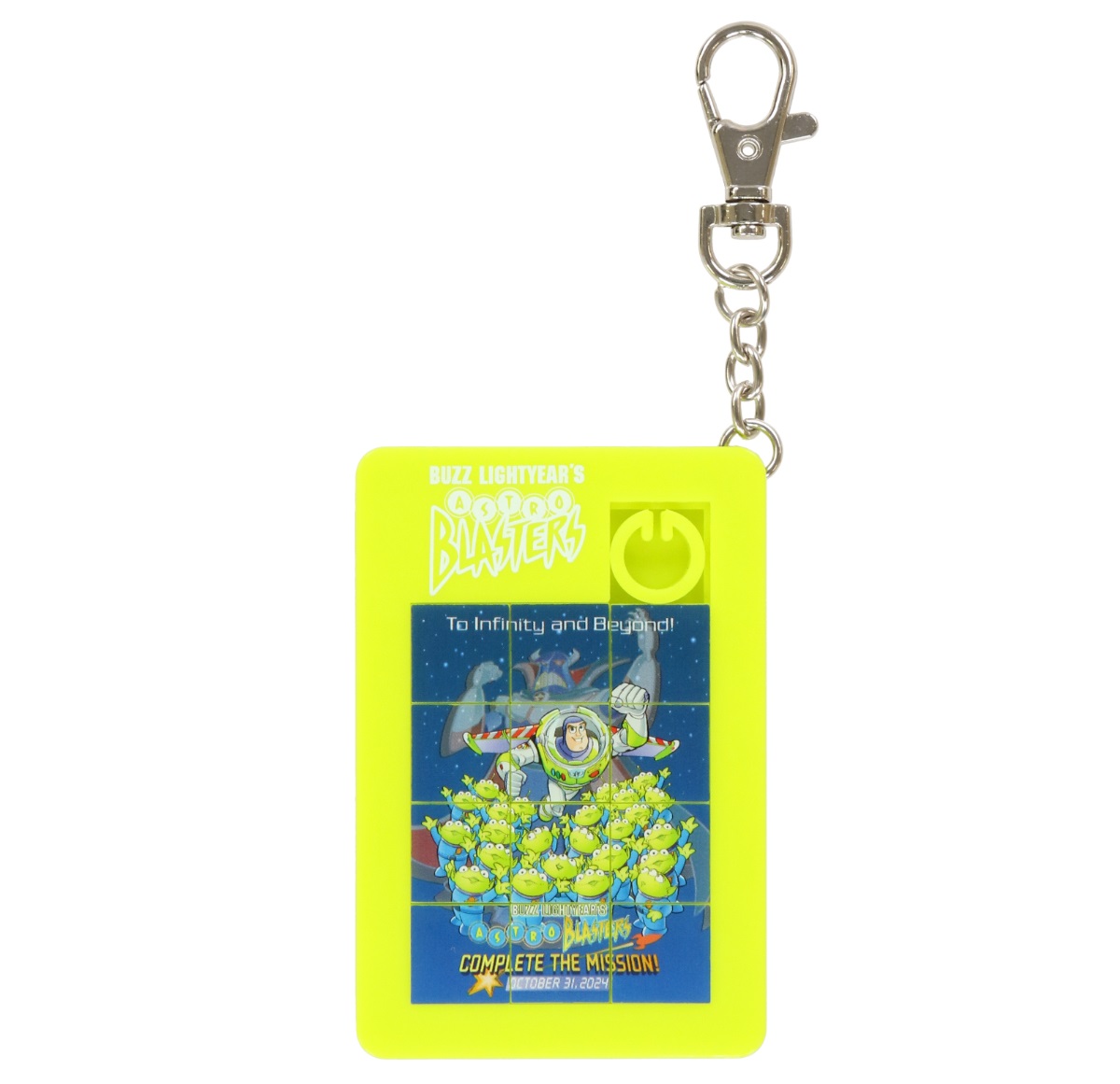 スライドさせて絵を揃えるパズルが付いたキーチェーン。アトラクションやパレードの待ち時間に遊べます。