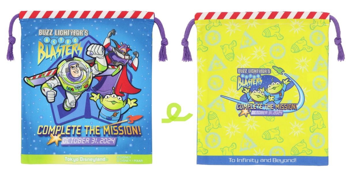 「バズ・ライトイヤーのアストロブラスター“コンプリート・ザ・ミッション!”」のロゴとクローズの日にちがプリントされたきんちゃく。裏面のリトル・グリーン・メンもかわいい。