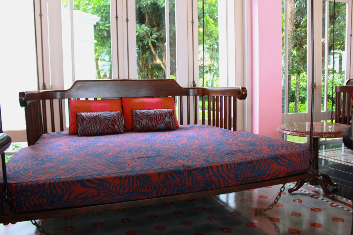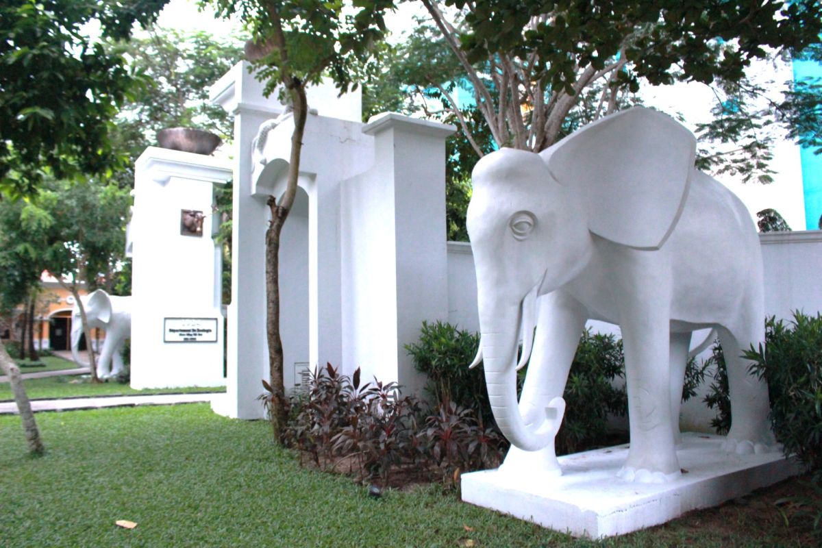 人類学、芸術学、農業学など全部で15の学科の棟があるなかで今回宿泊したのは「Zoology(動物学)」の棟。敷地内は広いのでバギーで移動することもできます。ここでしかお目にかかれなそうなゾウ型のトピアリー。棟ごとに建物の色が違い、外観のディスプレイや館内に飾られている画が、その学問によって変わってくるんです。