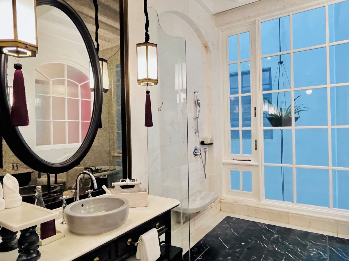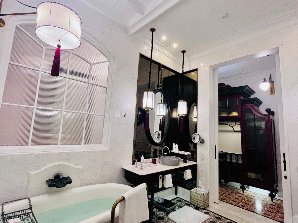 バスルームはこちら。洗面台が2面についています。片側の壁でシャワーを浴びて、悠々と歩いて浴槽へ。ベトナムは浴槽に浸かる文化はないため、高級ホテルでもしっかり浴槽が付いているケースは珍しいのだとか。