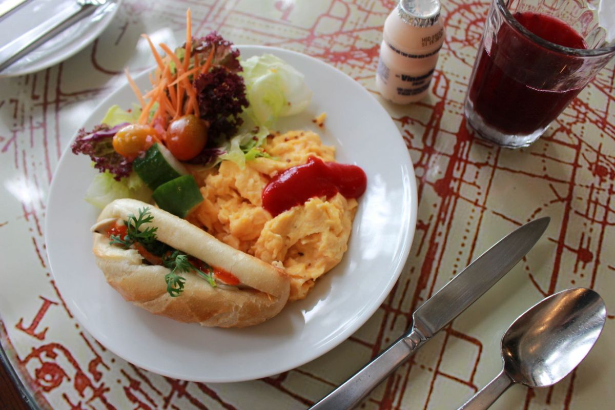 スクランブルエッグを作ってもらい、ミニサイズのバイン・ミーとサラダバーから好きな野菜を盛り付けていただきます! ちなみに右上に写っているのは乳酸菌飲料はさっぱりした味わいの「Vinamilk(びなみるく)」。