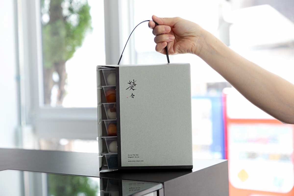 「Dango Chaya So-so」のだんごは、手みやげにもおすすめ。箱代275円で、だんごのケースが見えるおしゃれな持ち帰りボックスに入れてもらえます。