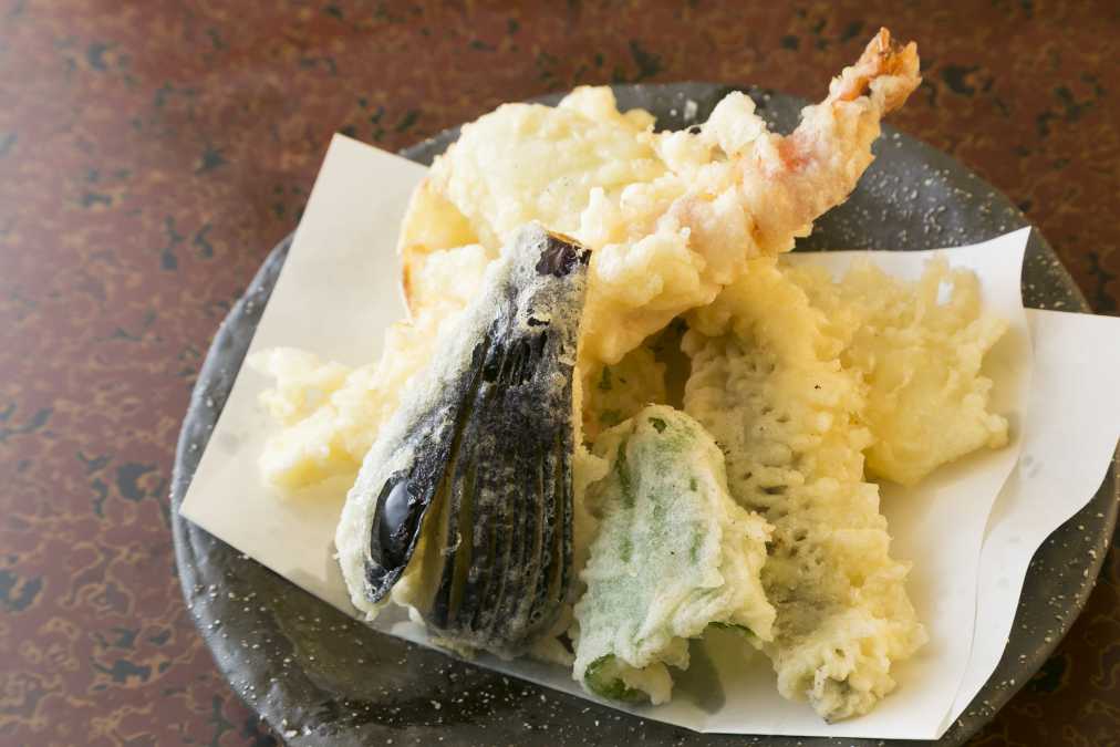 へぎそばをもっとおいしく食べたいときは、天ぷら盛り合わせ1000円がおすすめです。塩でいただくのもいいですが、ぜひ試していただきたいのが、つけ汁に少し浸して味わう形。