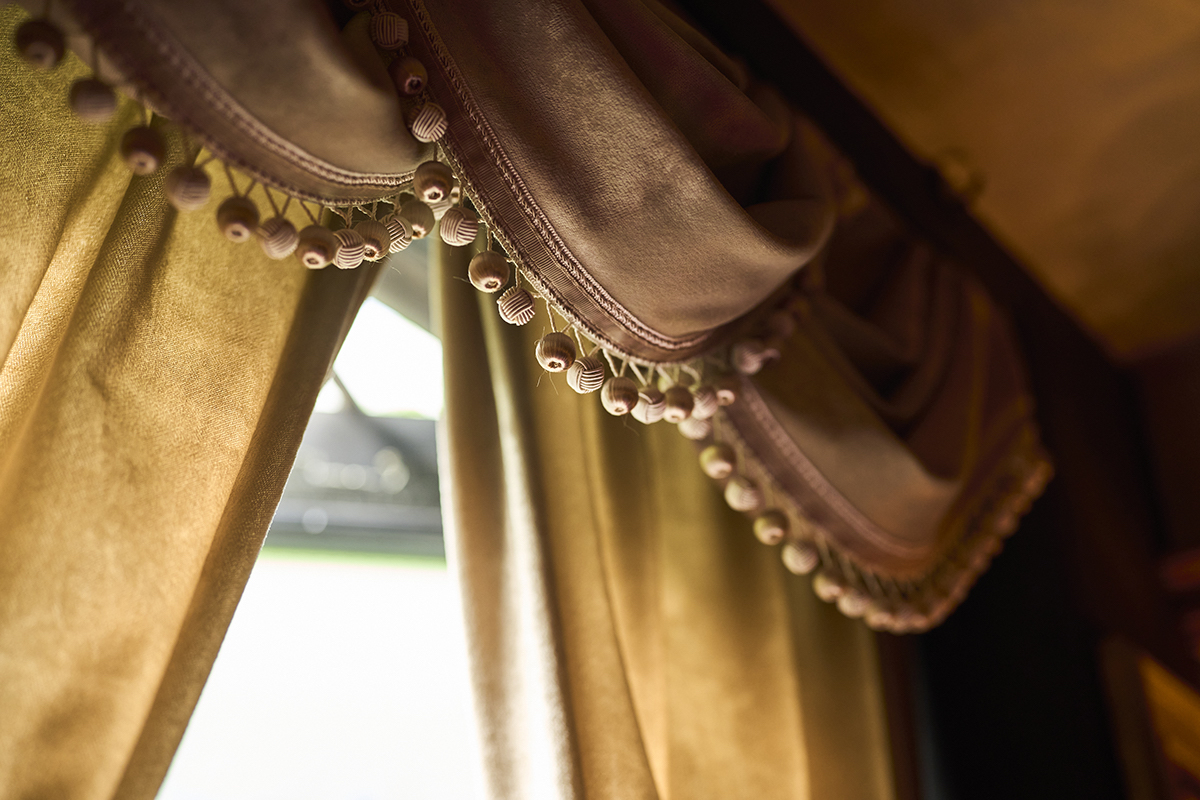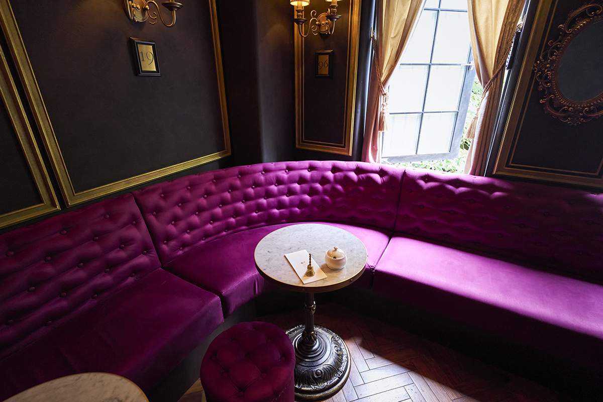 ドアを開けて左側のカウンター席とは対象的に、右側にはさらにゴージャスな世界が広がります。こちらのスペースは、バー営業の際はVIPルームとして使われていますが、ティーサロン営業時間は誰でも利用可能。壁沿いにぐるりと置かれたワインレッドのソファには丸テーブルが5つほど置かれているだけで、ひとりずつゆったりと腰掛けられます。