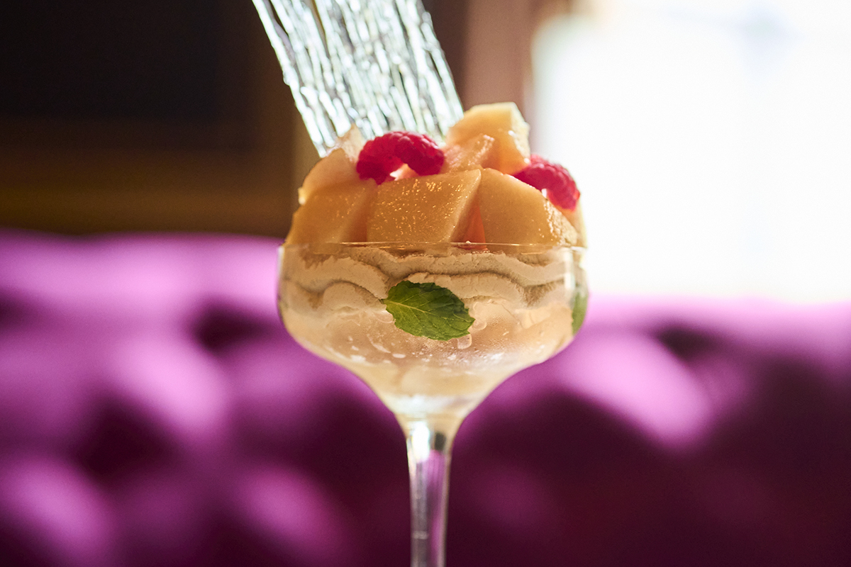 オリジナルのアールグレイのクリームをベースに、生の桃をワインで煮込んだ桃のコンポートを同時に味わえるぜいたくな一品。桃とワインのジュレ、桃のソルベ、ラズベリー、ミント……と、いろいろなおいしさを楽しめます。
