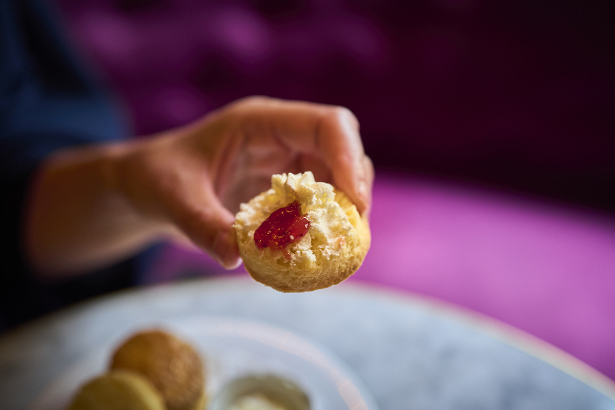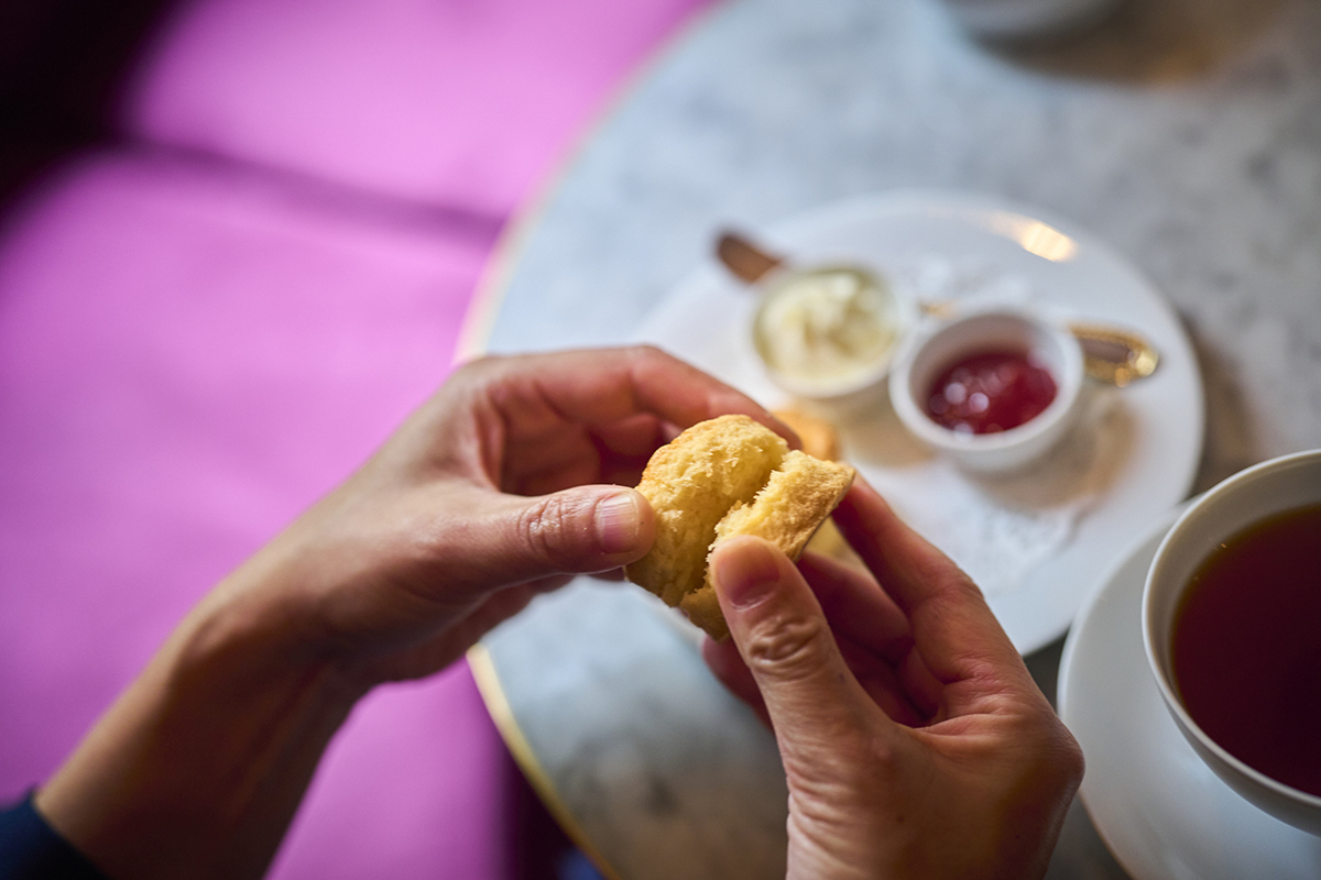 「オオカミの口」といわれるスコーンが焼き上がったときにできた側面の割れ目に沿ってスコーンを割り、ホイップクリームとジャムを塗って……。