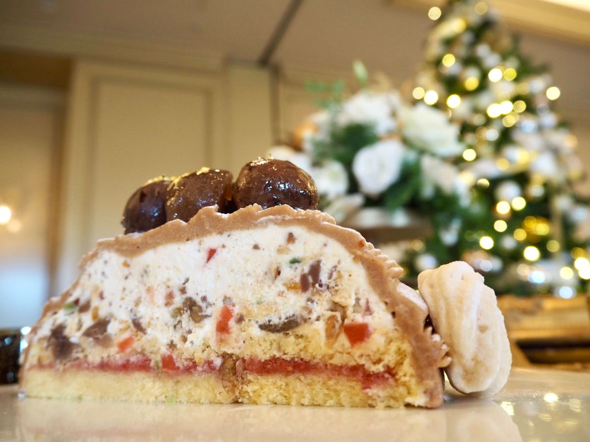 ケーキを切るとマロンクリームの下にはオレンジピールやドライチェリー、チョコレートを使用したクリスマスカラーのズコットが...…! カラフルな色合いがクリスマス気分をより盛り上げてくれそうですね♪