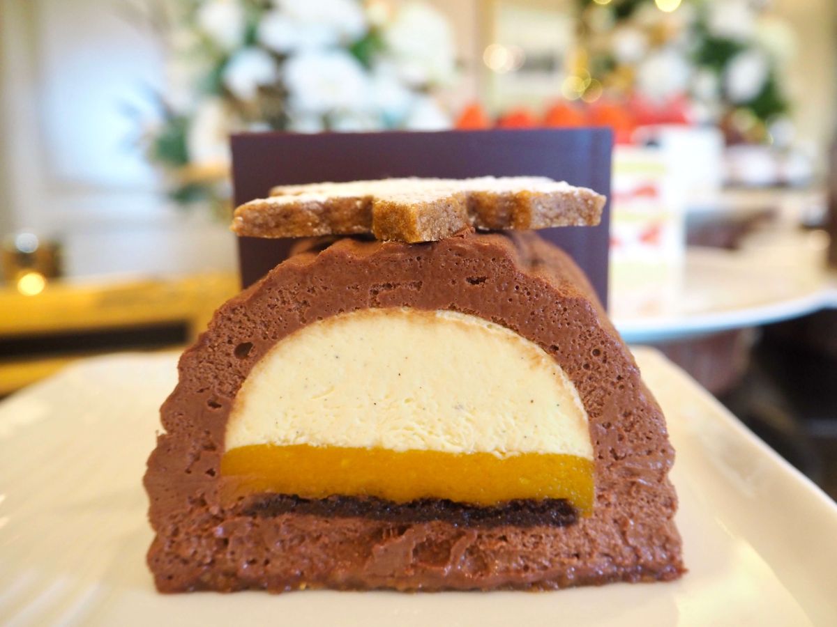 このブッシュ・ド・ノエルはチョコレートだけではなく、バニラのババロア、マンゴオランジェのジュレなど7種類の味わい、食感が融合しているんです! ひと口ひと口で異なる味わい、食感を楽しめますよ♪ チョコレートの濃厚さとバニラやマンゴーのさっぱりさがマッチし、いくらでも食べれそう!