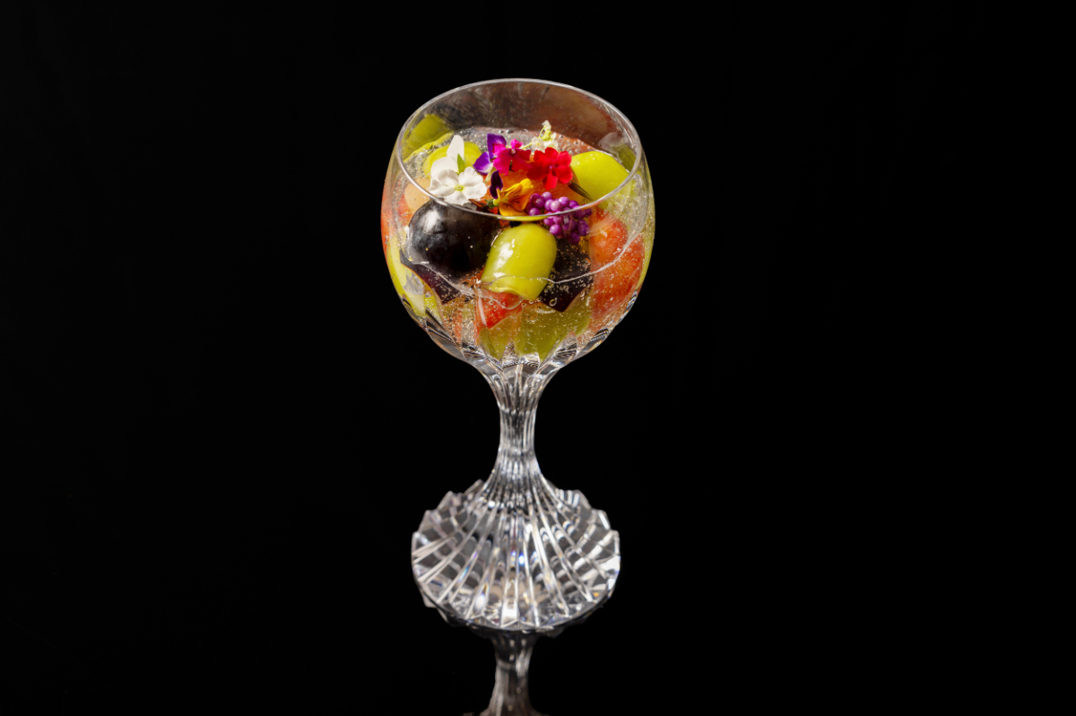 日本酒を使ったゼリーに、赤や紫、黄緑といった彩り豊かな八種類のブドウを使い、棚田から望む夕暮れや薄暮の空色を表現した一品。