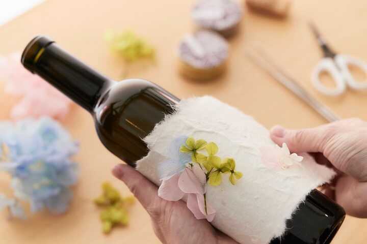 第2部で開催される体験プログラム「フラワーエチケット」作りでは、回廊で摘んだ花でワインのエチケットを作ることができます。自作のエチケットを貼ったワインボトルは、特別なおみやげに大変身!料金は1500円、先着10名なのでお早めに。