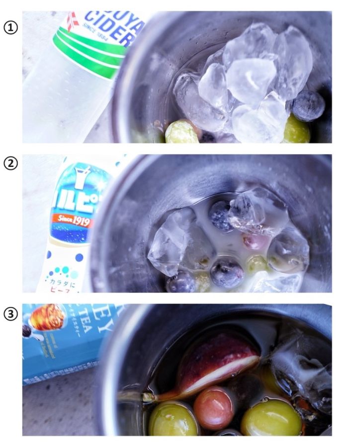 | ✓シャインマスカット、ナガノパープルなど皮ごと食べられるぶどう…適量 ✓イチジク…適量 ✓サイダー…1本(500ml) ✓カルピス(原液)…1本(470ml) ✓アールグレイティー(微糖)…1本(500ml) ✓氷…適量 (あればミント、エディブルフラワー…適量) |