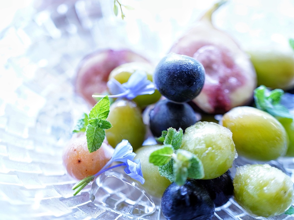 完成したら、ガラスの器に盛り付け、氷やミント、お花などを飾って。