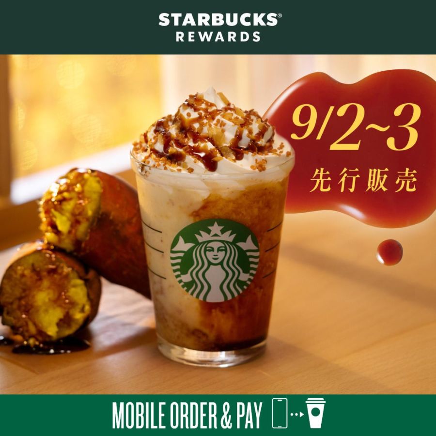 今回、「スターバックス® リワード」の会員限定で、「焼き芋 香ばしカラメル フラペチーノ®」を先行販売! レジに並ばず事前注文決済ができるモバイルオーダーと、公式アプリ内の二次元コードをレジで掲示する、2種類の方法で9月2日(月)から購入することができます。