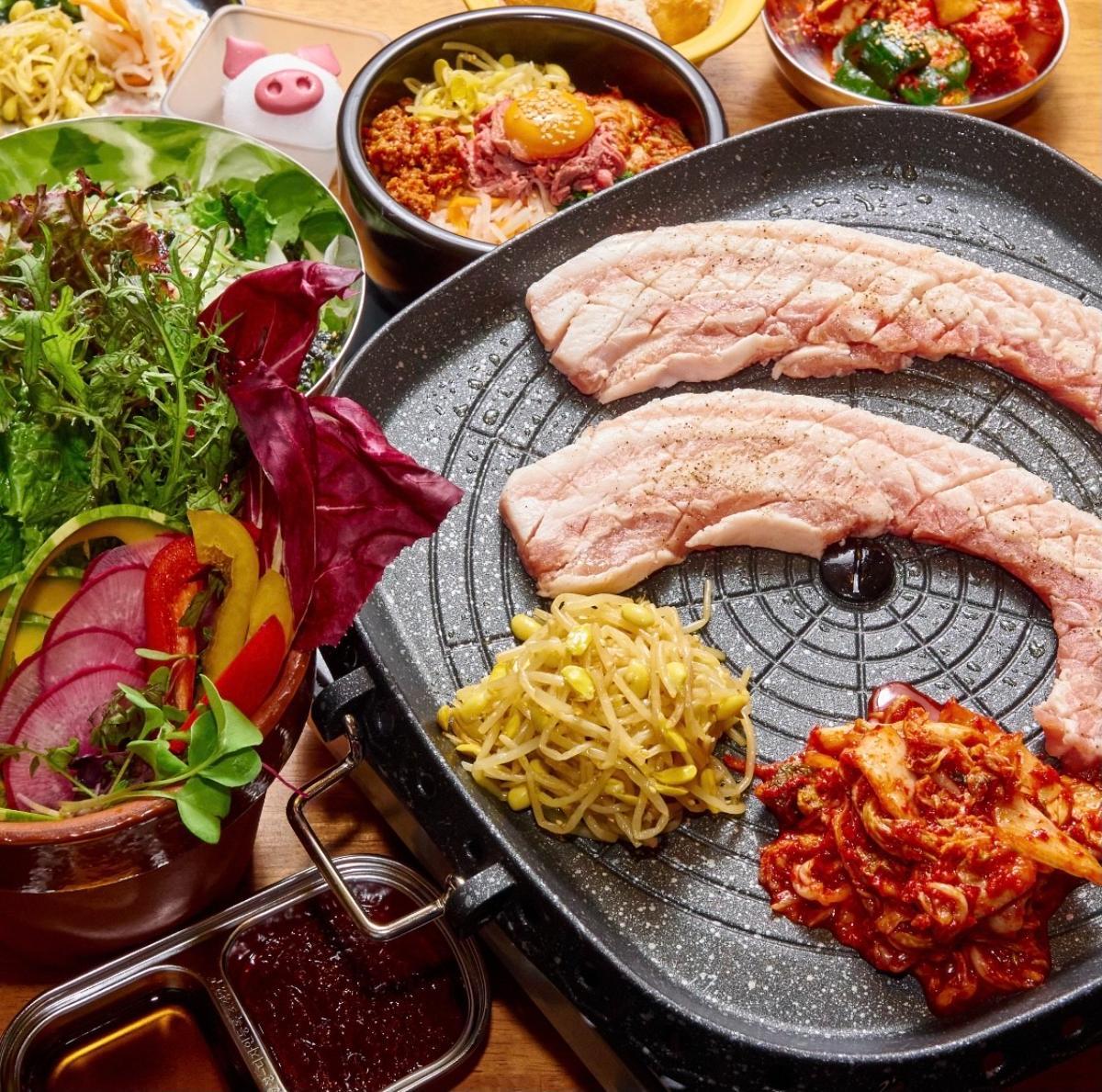看板メニューの「サムギョプサル」(バラ880円など)は、分厚くて食べ応えたっぷり。お得な「お昼限定食べ放題」1680円や、「サムギョプサル&韓国料理食べ放題」3300円などのプランもあります。