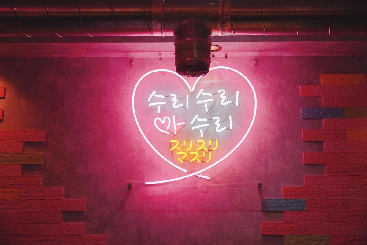 壁に光るネオンサインやモニターから流れるK-POPの映像で韓国気分が盛り上がる、サムギョプサルとフライドチキンのお店「韓国料理 スリスリマスリ 梅田店(かんこくりょうり すりすりますり うめだてん)」。