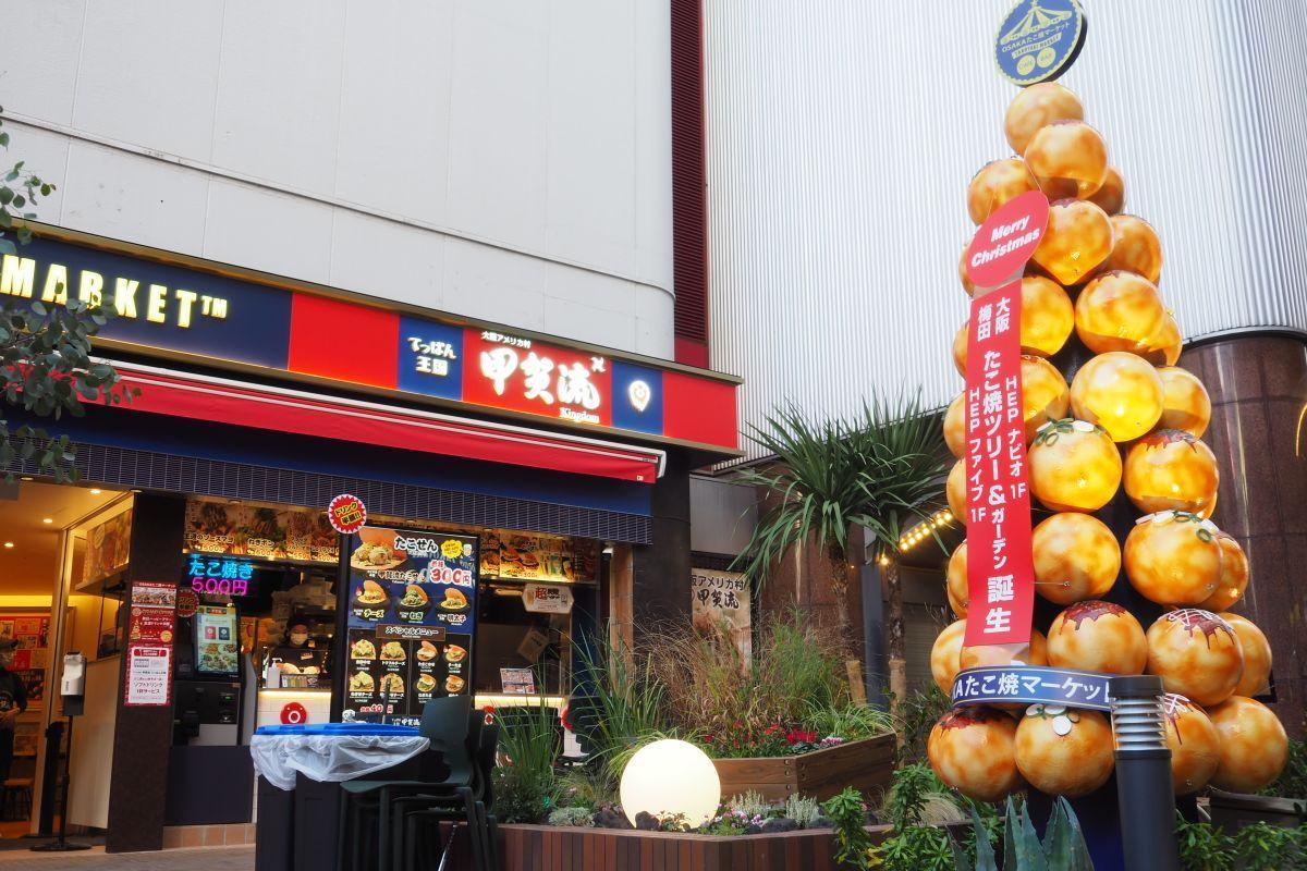 5つの人気たこ焼店の味を食べ比べできるスポット「OSAKAたこ焼マーケット(おおさかたこやきまーけっと)」があるのは、大阪梅田HEPファイブとHEPナビオの間。大きなたこ焼ツリーが目印です!