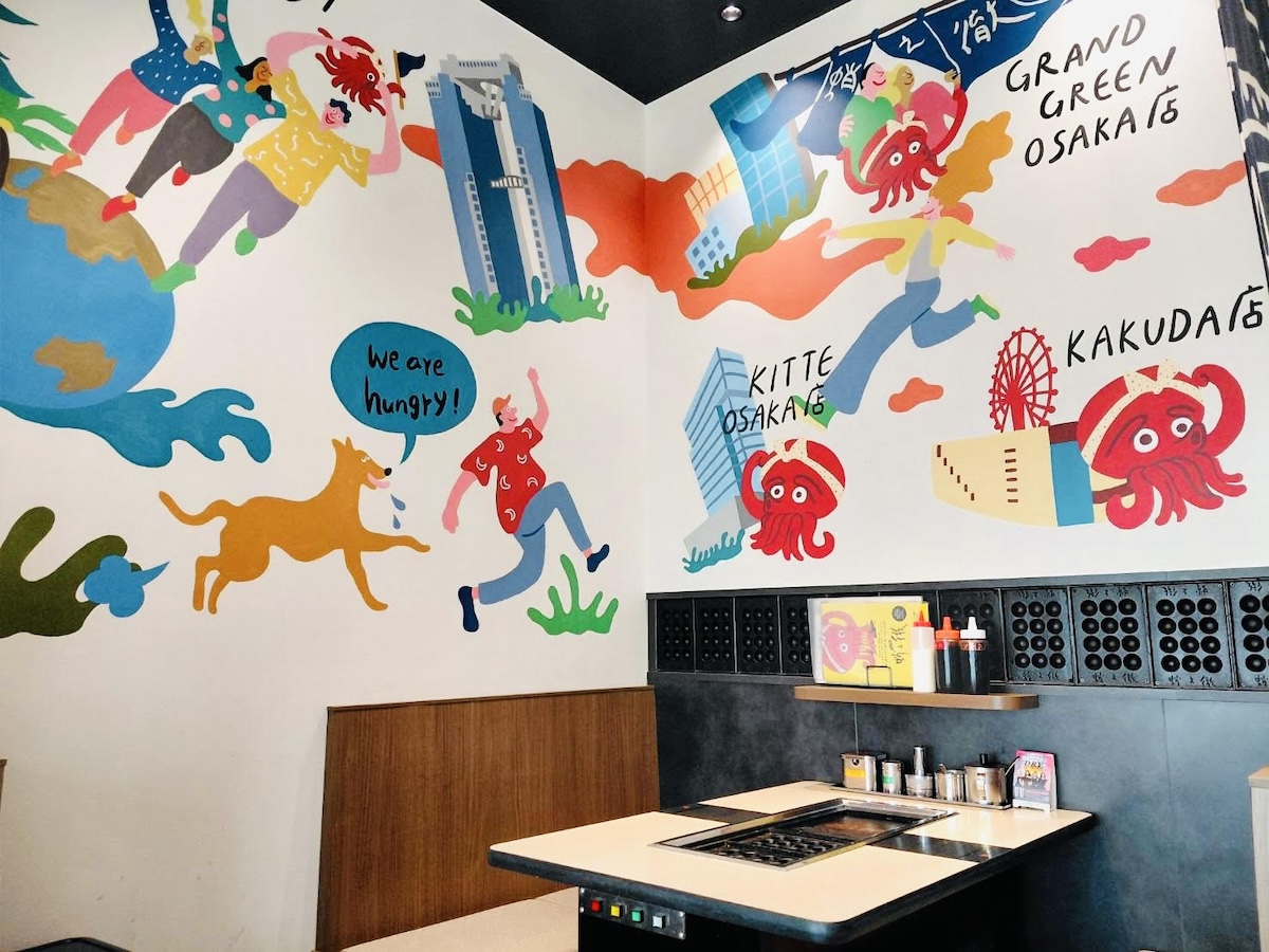 店内には、イラストレーター・オリハラケイコ氏による壁画やタコのキャラクターが散りばめられていて、写真映えスポットとしても人気。その楽しさとおいしさが一体になった体験型ランチスポットです。