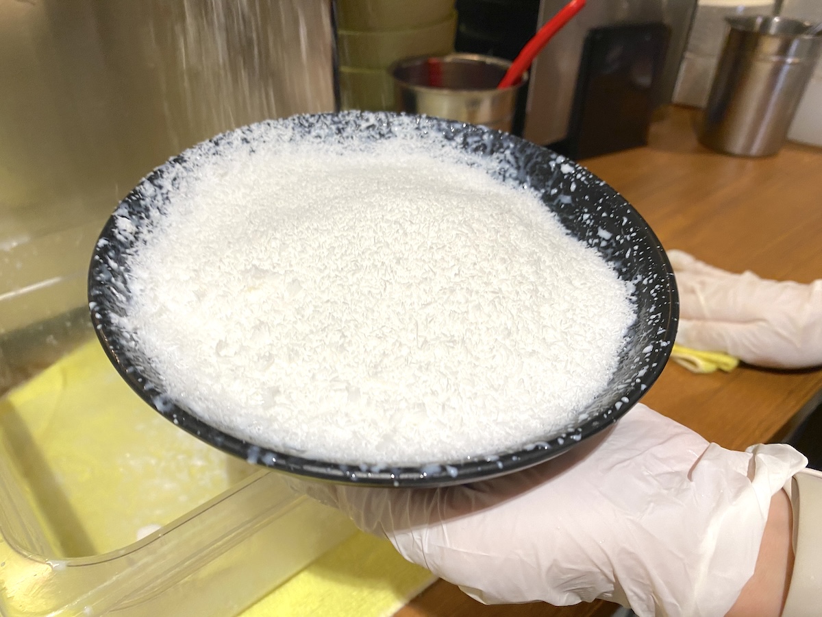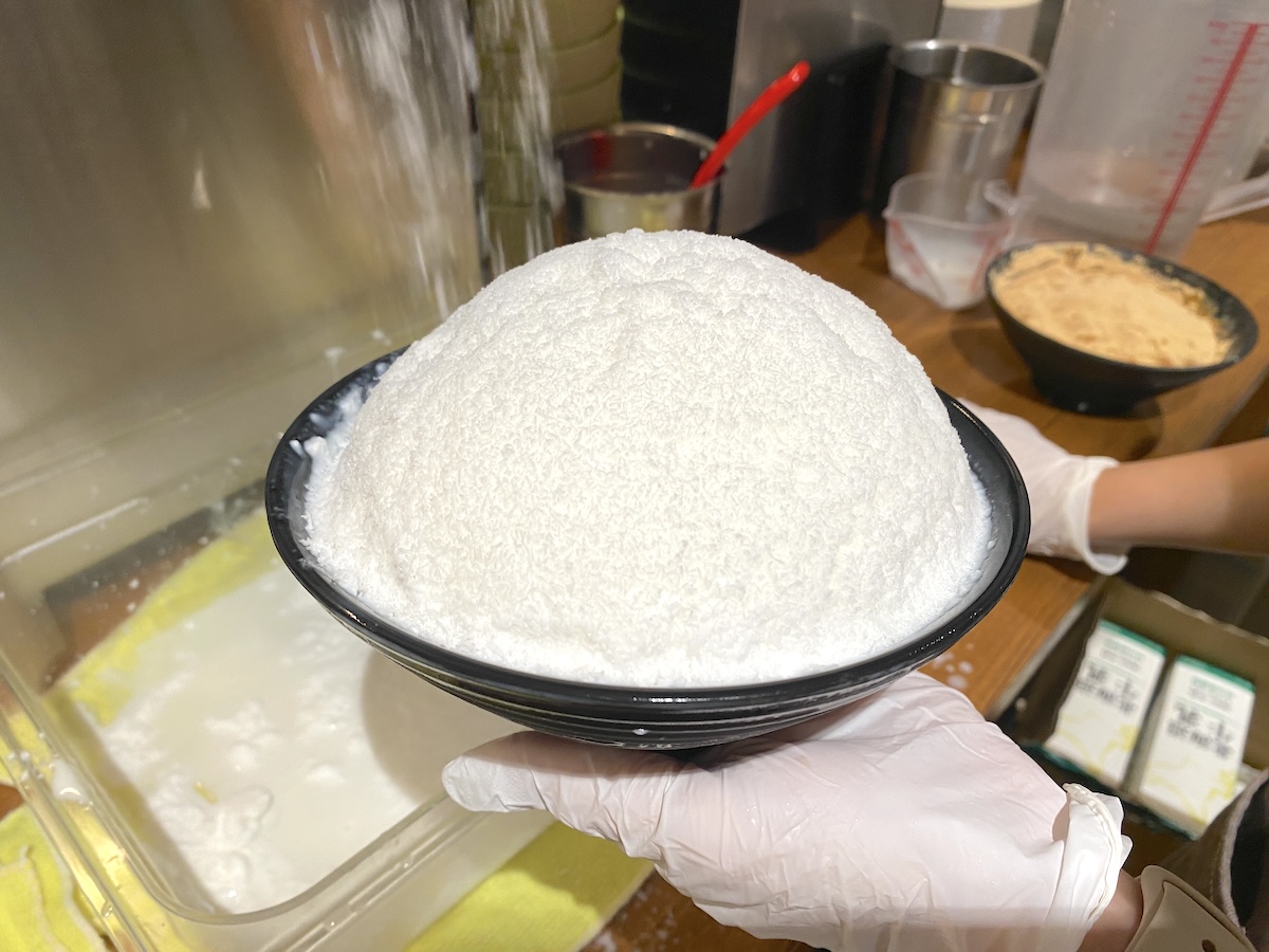 食べてみて、まずかき氷の大事な要素である氷に驚き。水だけで作られた氷と違い、練乳や生クリームなどを合わせているため氷自体にしっかりと味がついていてGOOD。ふわふわとした食感と口溶けのよさもたまりません。