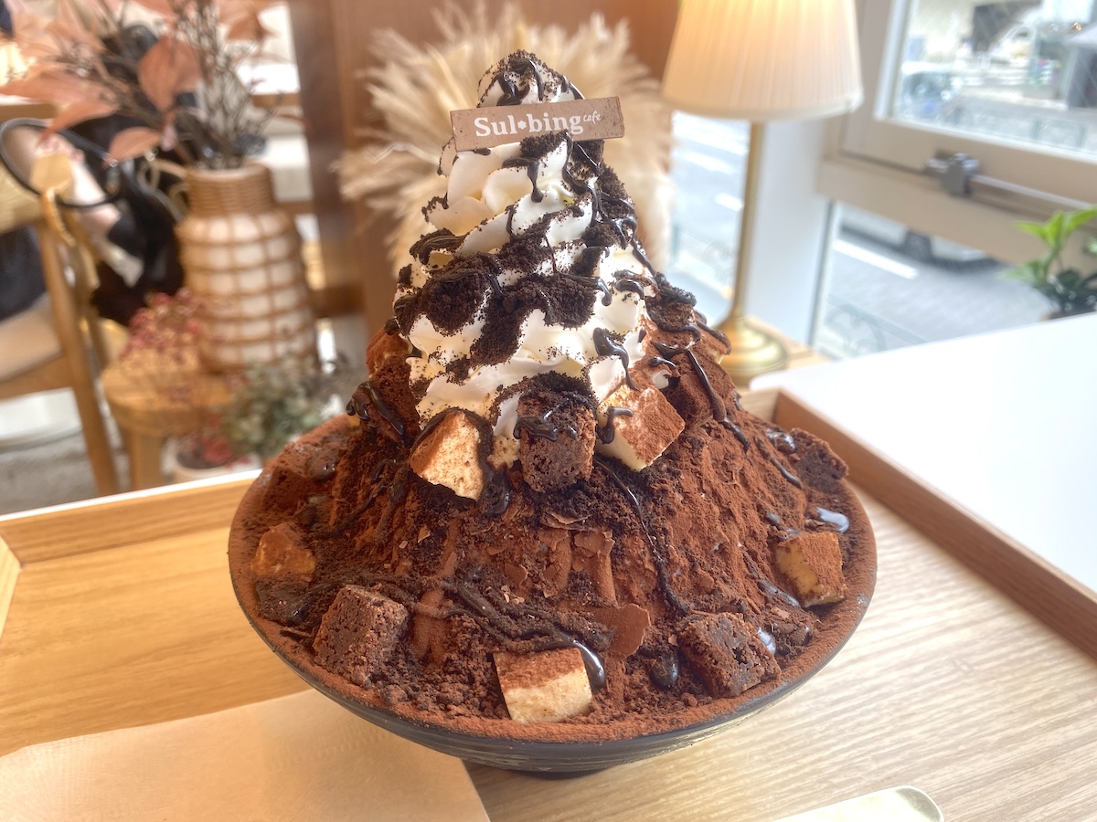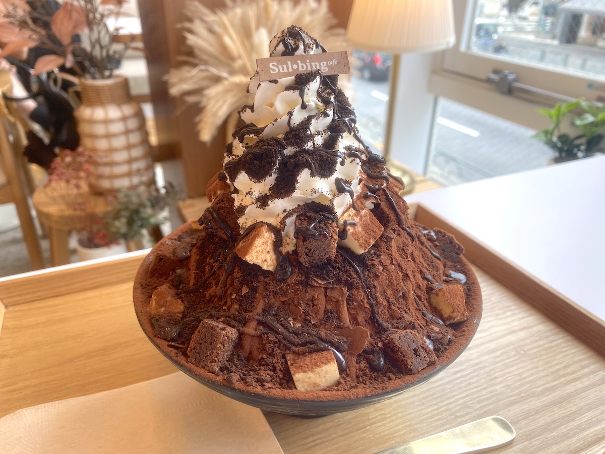 氷を削り、形を整えて3層目をつくったあと、再度練乳と生チョコソースをかけて、ミルクチョコスライス、カカオパウダー、生クリーム、チョコブラウニー、チーズケーキ、チョコプレートをのせて完成です。様々な食感と味わいのチョコがたっぷりとトッピングされていて、チョコ好きにはたまらないソルビンになっています。