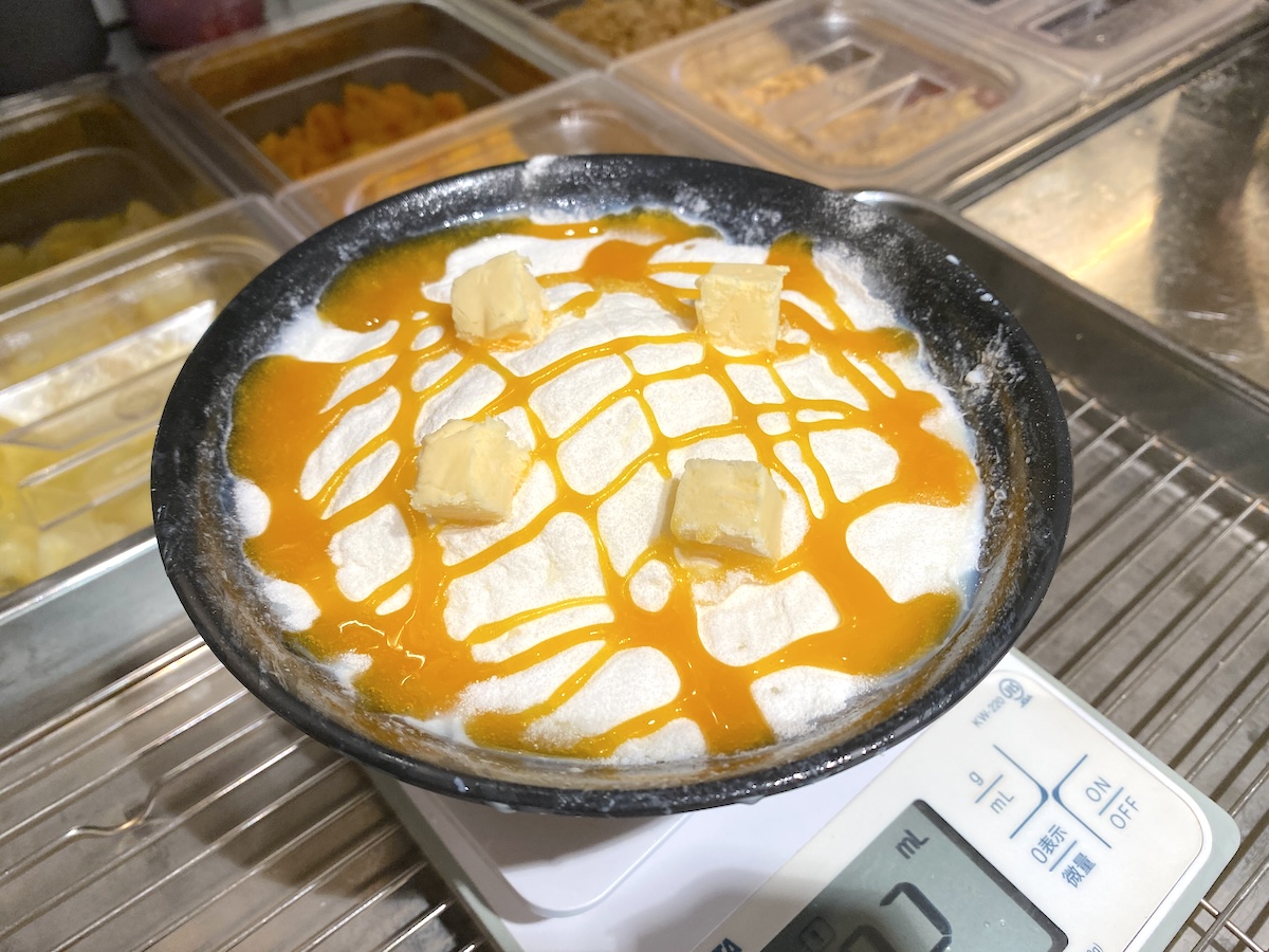 もう一度氷を削って形をドーム状に整えたら、最後に練乳をかけて、アップルマンゴー、マンゴーソース、手作りチーズケーキ、ヨーグルトアイスとチョコプレートをのせてできあがり!