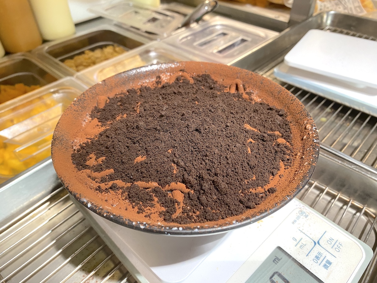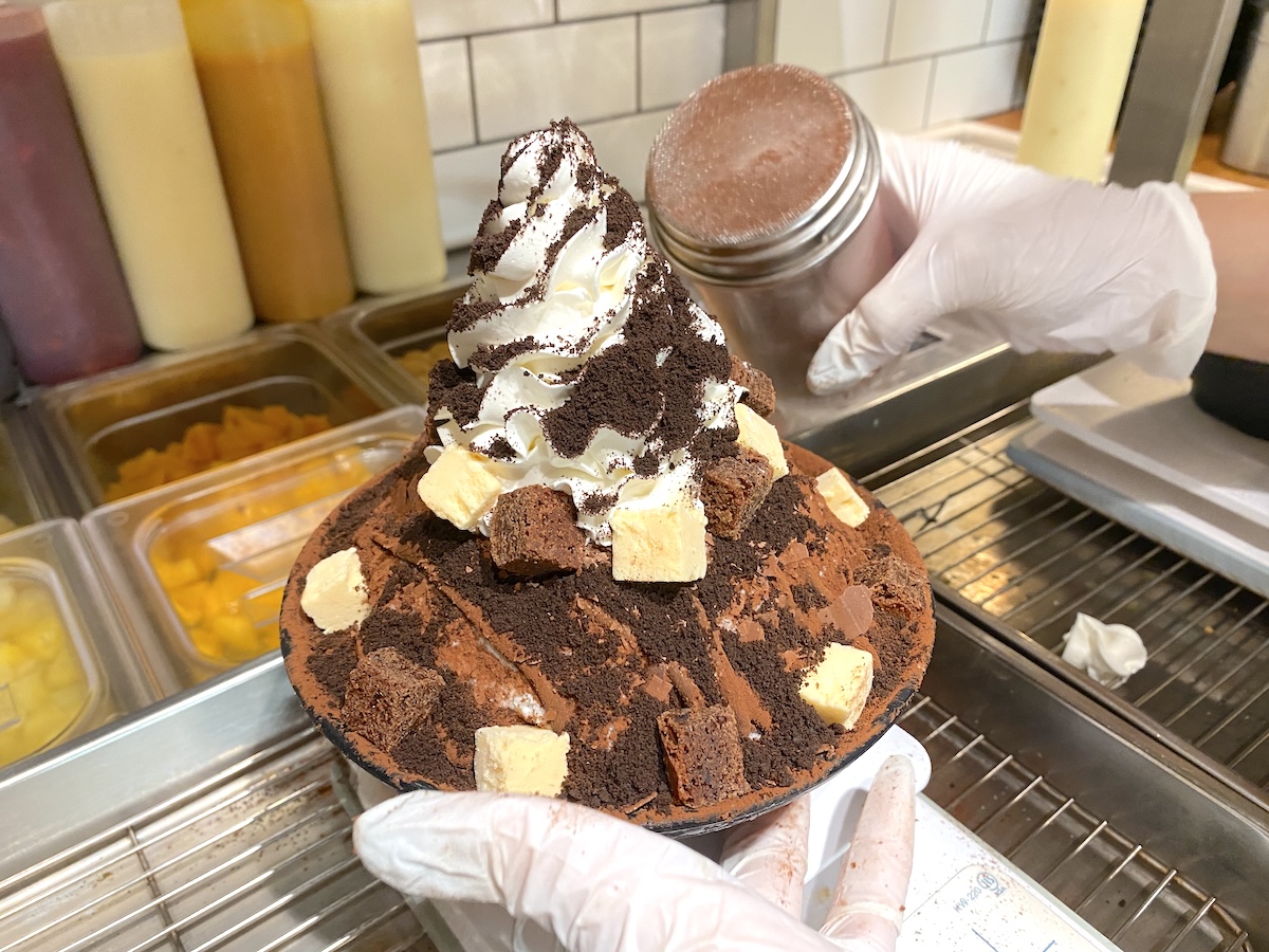 こちらも人気の「チョコブラウニーソルビン」1639円。氷を削り、練乳をかけるまでは「アップルマンゴーチーズソルビン」と同じで、ここから生チョコソースとカカオパウダー、オレオクッキークランチをトッピング。