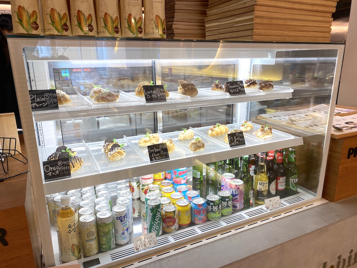 オーダーは入り口から向かって右にあるカウンターで行います。カウンター横のショーケースには、マスカルポーネチーズをふんだんに使ったクロワッサンや韓国のソフトドリンクやビールが並んでいるので気になった方はぜひチェックしてみて。