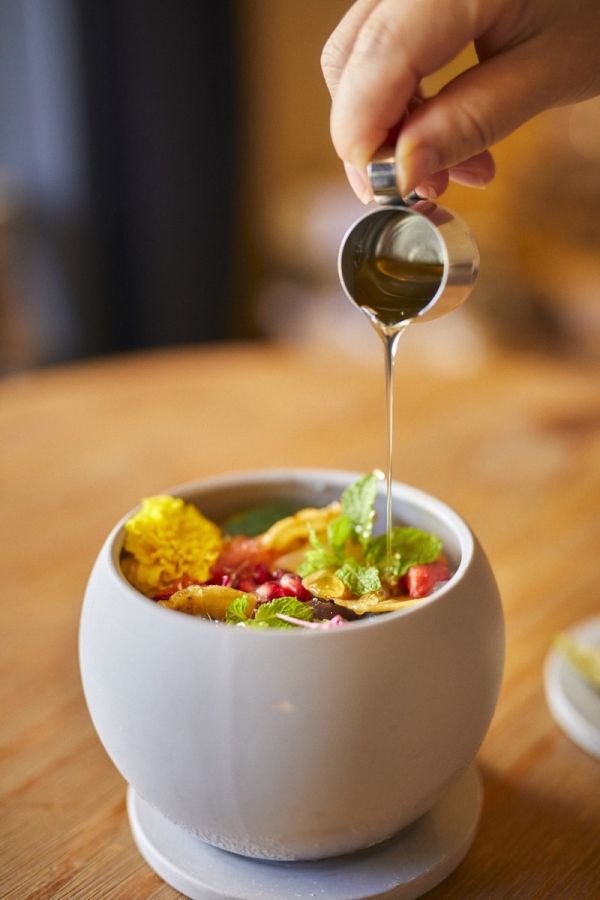 シロップは、ココナッツの花から抽出したココナッツネクターというもの。糖質が体内に吸収されにくく、ミネラルが豊富に含まれているため、健康を気遣う人に注目されている糖分なのです。ただ美しく盛り付けるだけではなく、果実それぞれの性質に合わせてひと手間加えられ、そして素材にはとことんこだわる。それが、「Au point de rendez - vous」のフレンチスタイルアサイーボウルです。