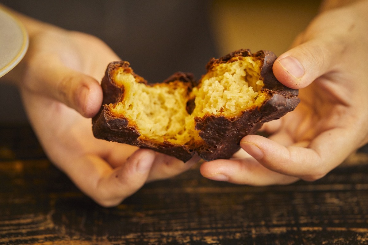 そうやって焼き上げた高温で焼き上げたカヌレは、外は歯にあたるほどカリッとしているのに中は半熟のようにしっとりとした食感。手で割ると焼き目の美しさ、生地のしっとりとした質感がよくわかります。さらには一般的なレシピの約2.5倍のラム酒を使用。アルコールを飛ばして、芳醇な香りだけをカヌレの中に閉じ込めます。