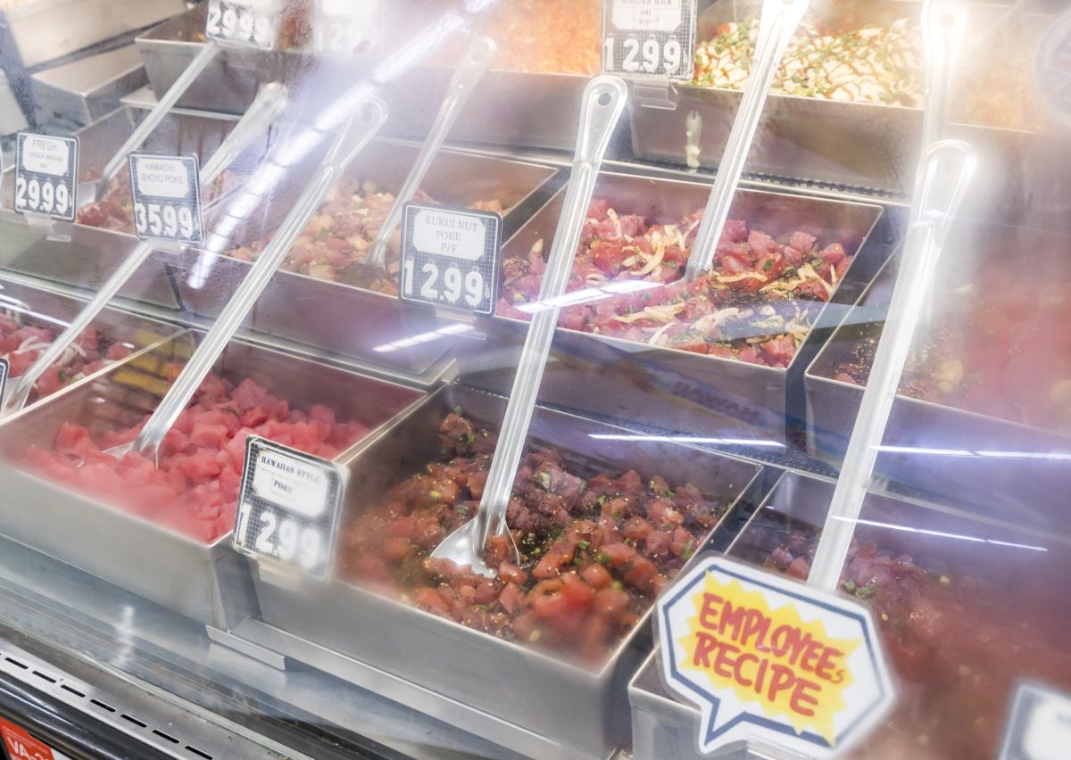 そのほか、バラエティ豊かなポケをはじめ、新鮮な魚介類や、アメリカのスーパーでは珍しい薄切り肉なども揃っています。