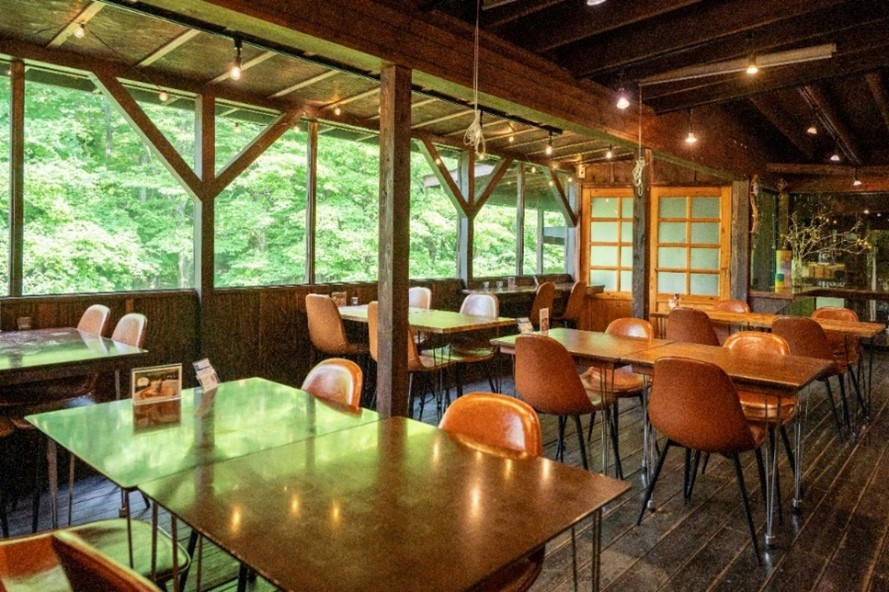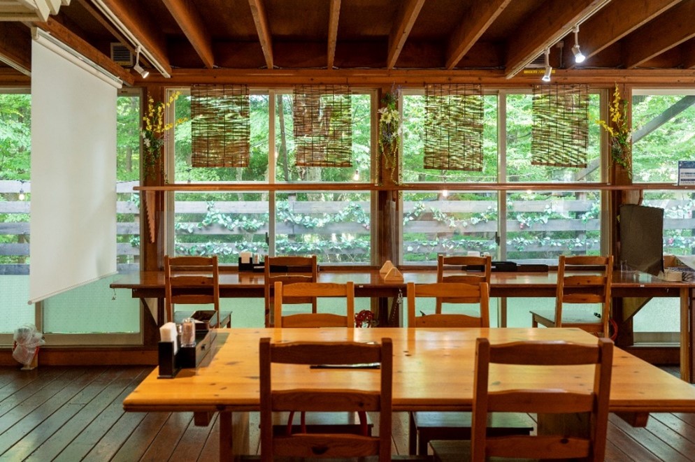 ウッディーで広々とした店内は、自然の景色を見ながらチーズ料理を楽しむことができます。