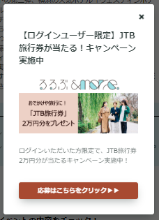 応募方法はとっても簡単。『るるぶ&more.』のサイトにログインした状態で、画面に出てくるポップアップをクリックして応募。応募者の皆様より抽選で1名様に、「JTB旅行券」2万円分をプレゼントします!
