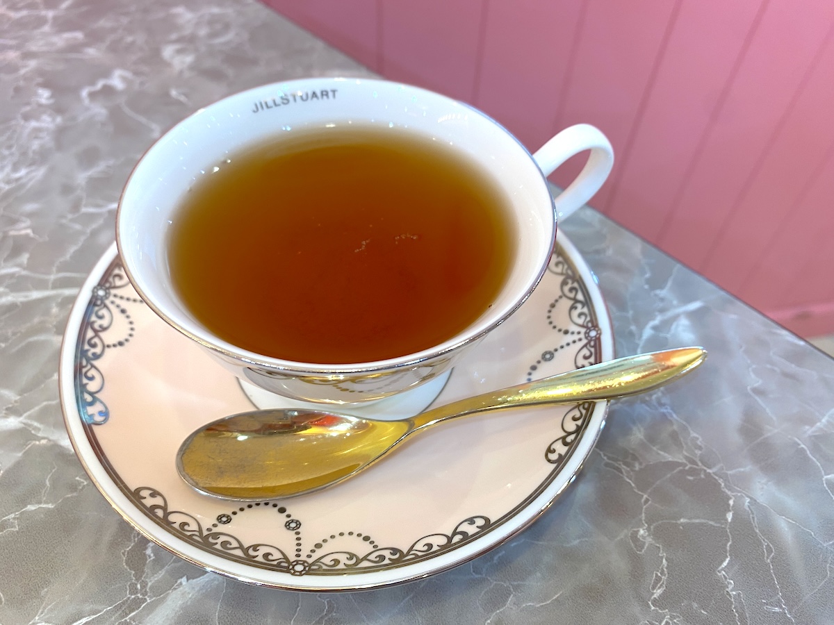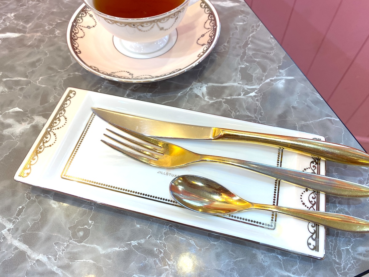 グラス以外の食器やカトラリーはすべて「JILL STUART」。女子の好みのツボをおさえたセレクトで、フェミニンなデザインに心がときめきます。