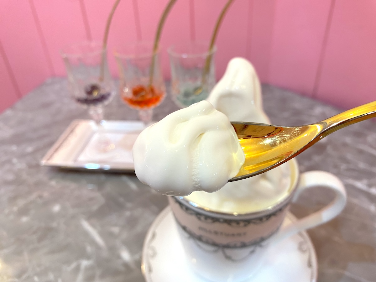 まずはこだわりのソフトクリームをそのままペロリ。今回選んだのは店長がとくにおすすめする「クレミア」です。口溶けがよく、濃厚なミルキー感が一気に広がります。またコクもあり、口からなくなった後も甘い香りの余韻が残るので甘いもの好きにはたまりません! ソフトクリームの下にはシリアルが入っていて、サクサクと楽しい食感も味わえます。
