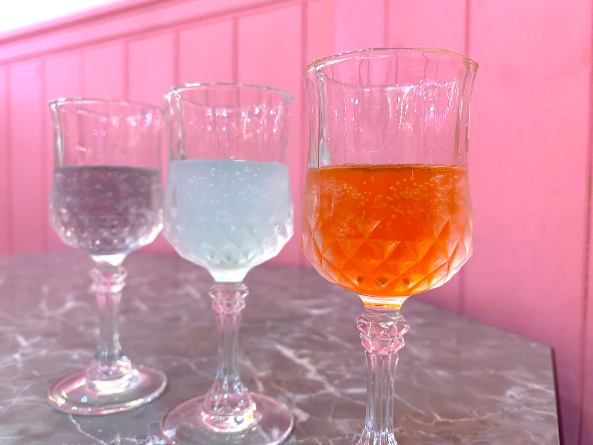アイスを食べきってしまって、リキュールが余ってしまったときは追加料金でオプションの「炭酸水」350円をオーダーしてみて。おとぎ話にでてきそうなキラキラ輝くドリンクになって、リキュールのいい香りと味わいをゴクゴク楽しめます。
