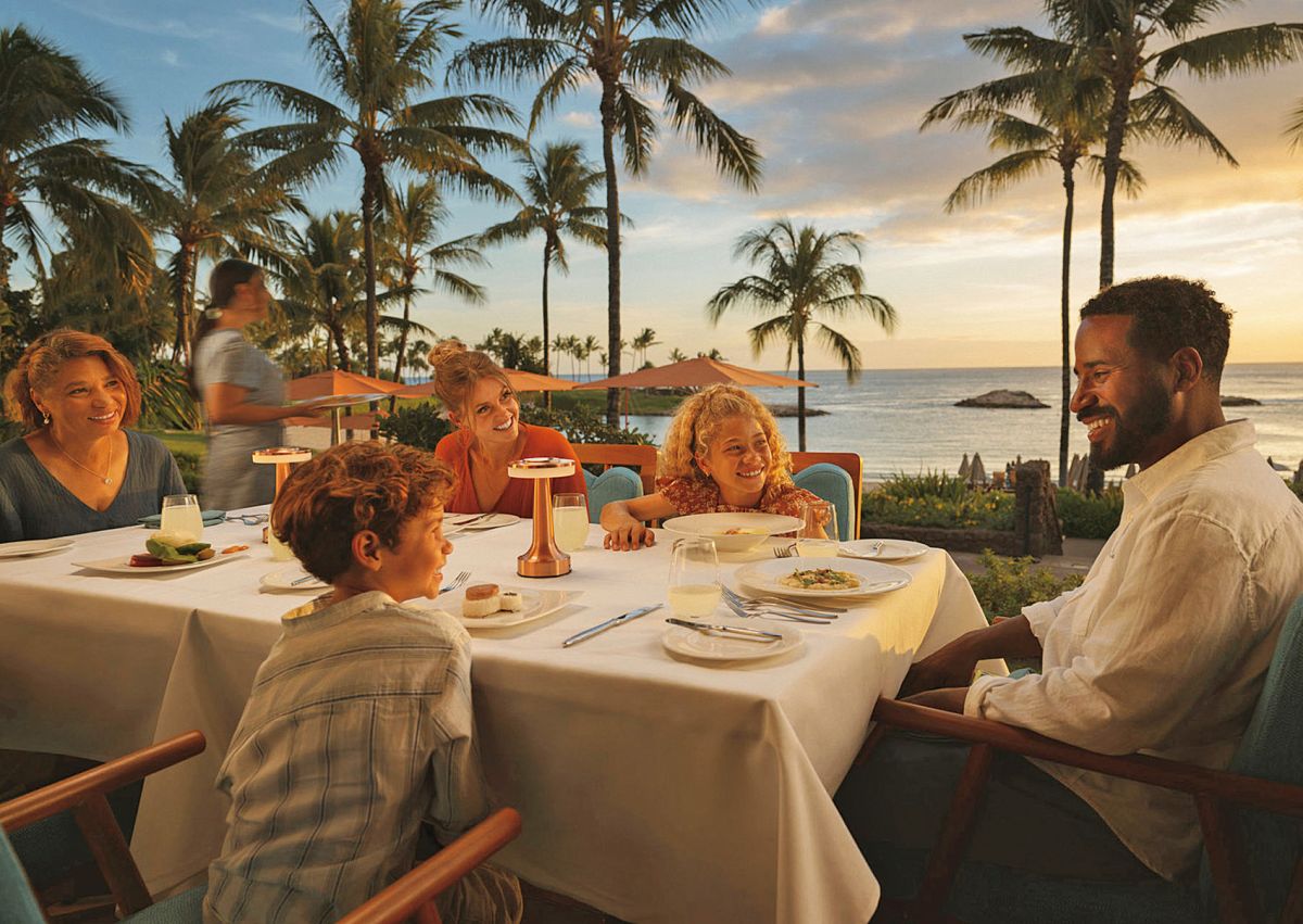 リゾート内には個性豊かなレストランが多数あります。コオリナのビーチを一望できるファインダイニングからディズニーキャラクターと出会えるレストラン、カジュアルなカフェまで、旅のスタイルに合わせて、アウラニならではの食事を満喫できます。
