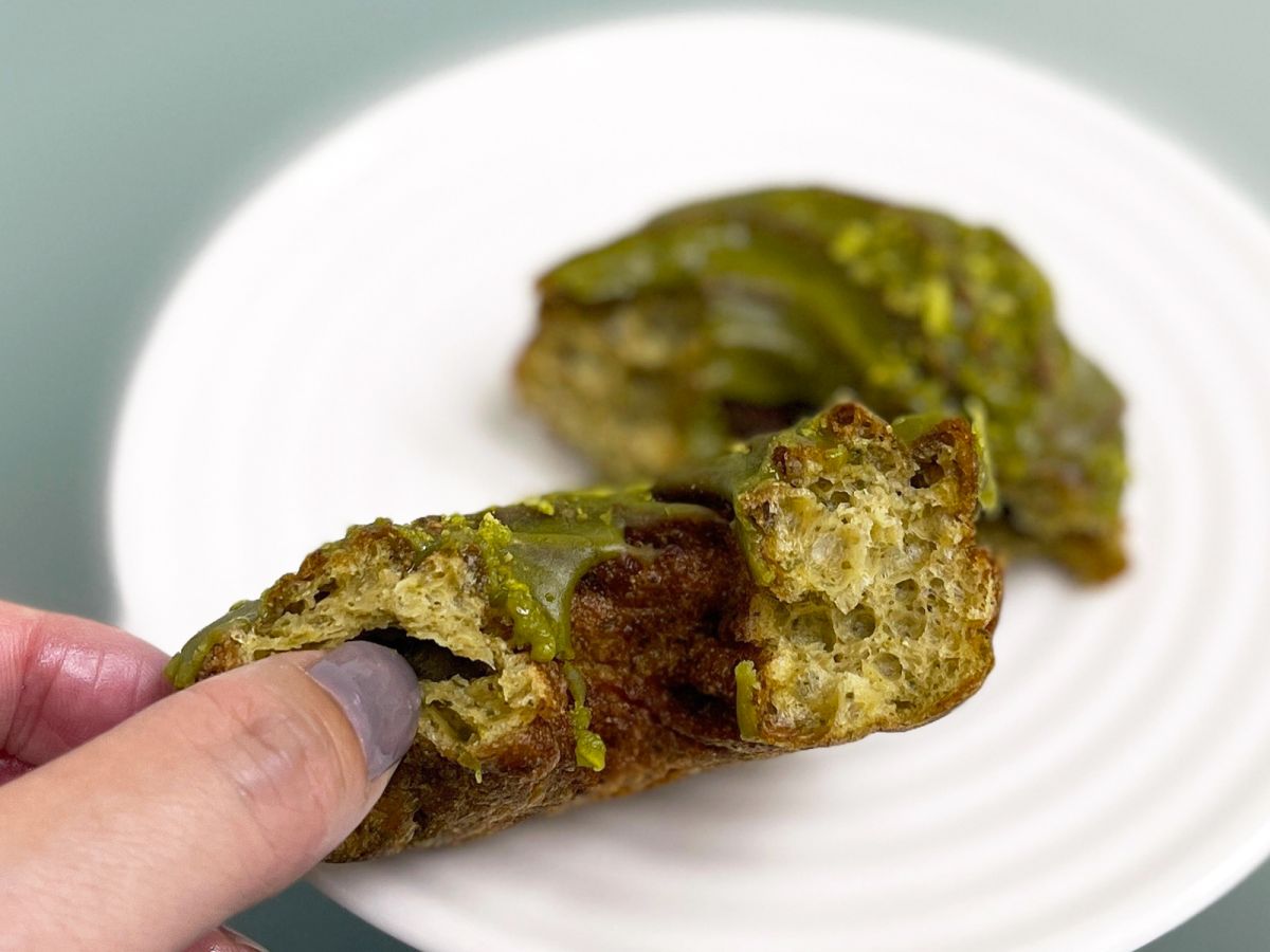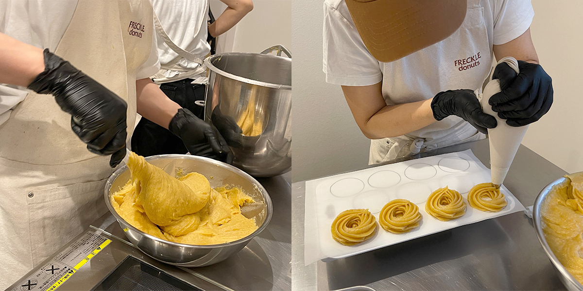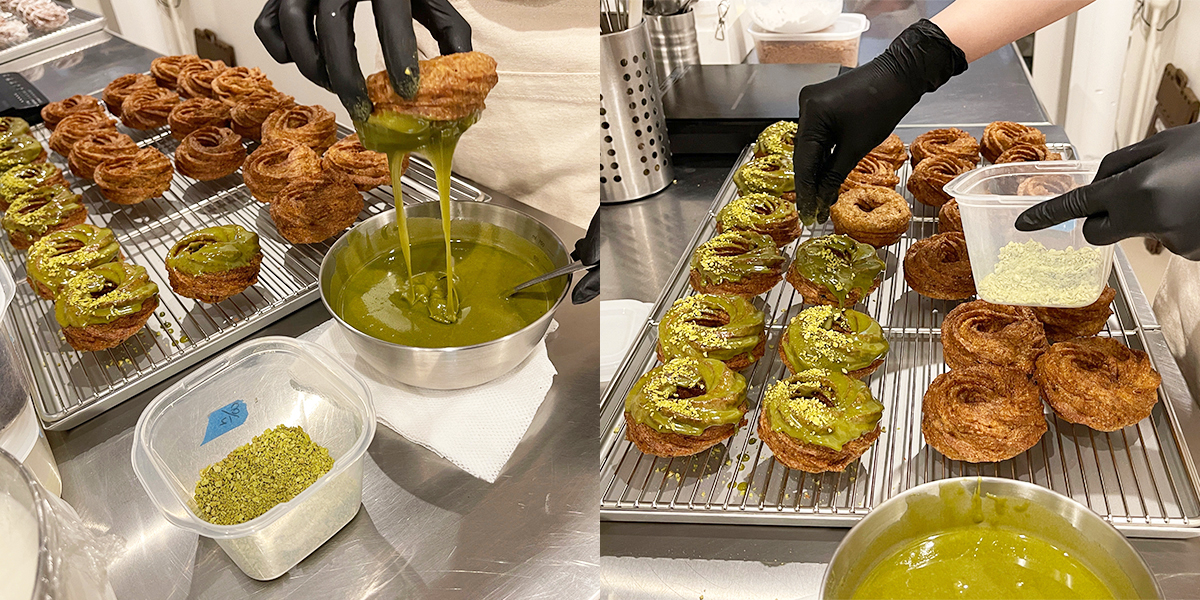 こちらは静岡の無農薬お茶農家「杉本園」の「深蒸し煎茶」を使用した、「煎茶 Sencha」フレーバーのフレンチクルーラーを作っているところ。