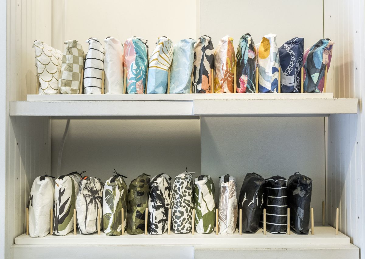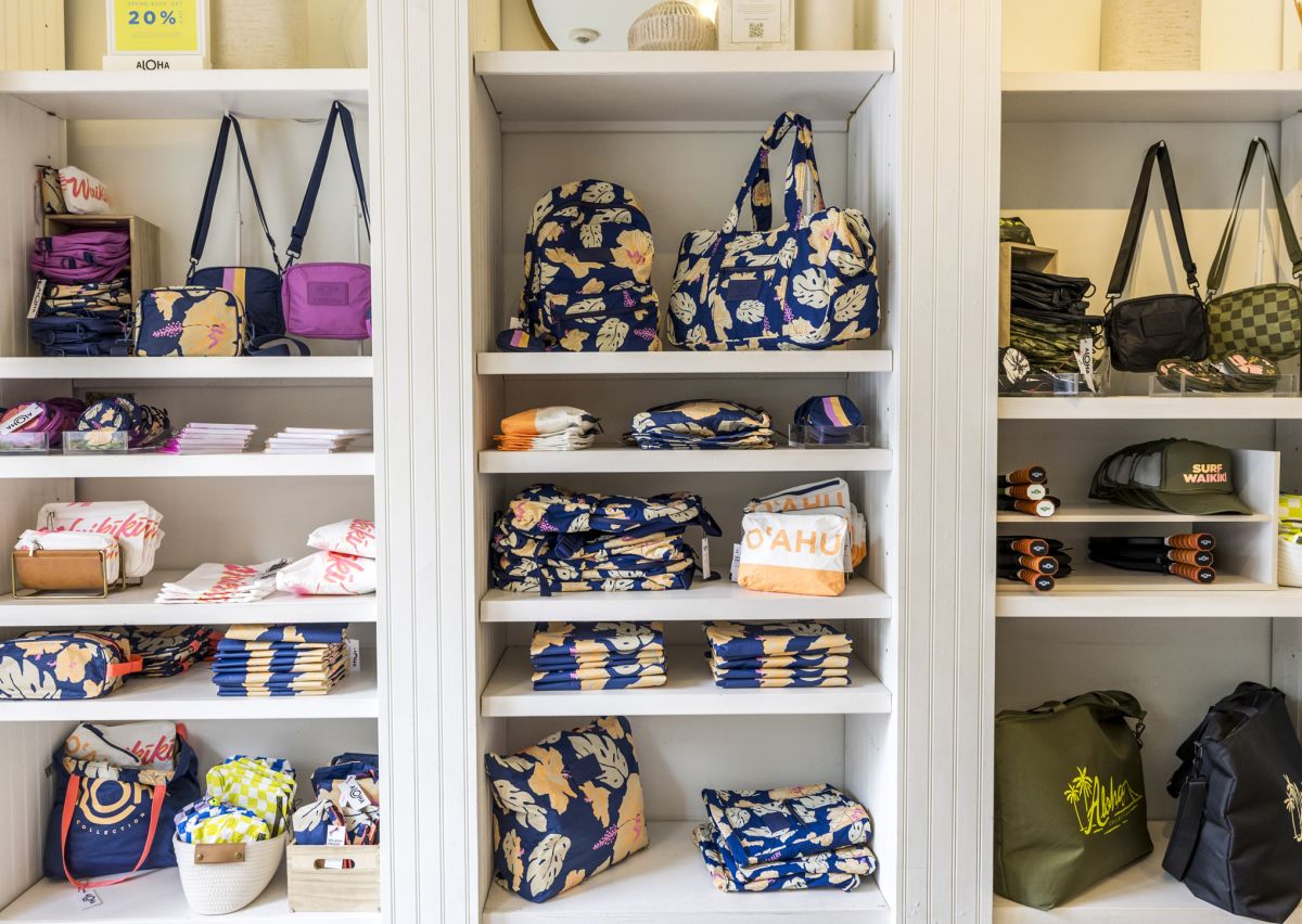 店内には、定番の「トートバッグ」や「ポーチ」をはじめ、「ダッフルバッグ」や「クロスボディバッグ」、「バックパック」に「ヒップパック(ウエストポーチ)」まで、幅広い商品が並んでいます。「ALOHA COLLECTION」のバッグには、軽量で強度があり、防水性に優れたタイベック素材が使われているので、濡れた水着などを持ち運ぶのにもぴったり。ビニール製と違い通気性もあり、洗濯機で丸洗いできるのも大きな魅力です。