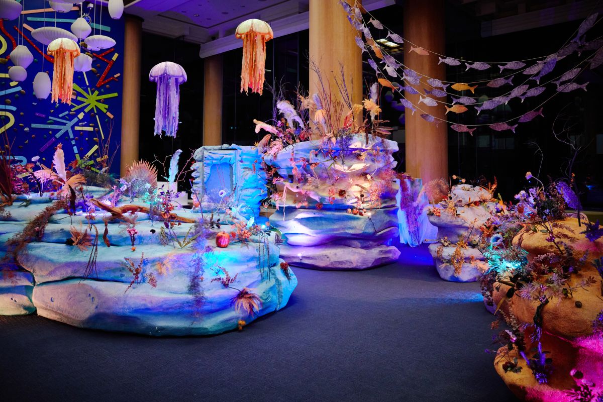 相模湾を表現した吹き抜け空間「アクティビティラウンジ」は、海藻が生息する岩礁をモチーフにしたオブジェと、色鮮やかなサンゴの装飾飾り付けで、海の中をイメージした空間に変身。さらに天井には魚群を表現したガーランドやクラゲがモチーフもあり、装飾を眺めたり、写真を撮ったりして、まるで海の中でハロウィンを楽しんでいるかのような気分で過ごせます。
