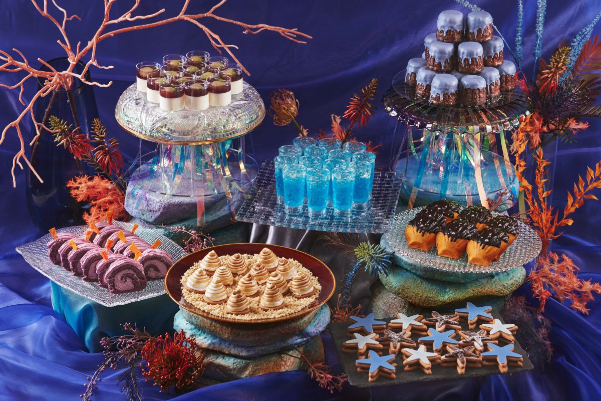 静岡県にちなんだ柑橘を使用したヒトデ形のサンドクッキーと巻貝をモチーフにしたタルトシトロン(写真中央下)や海藻由来のアガーで作った海の色を表現したゼリー(写真中央上)など、リゾナーレ熱海ならではのハロウィンスイーツが並びます。