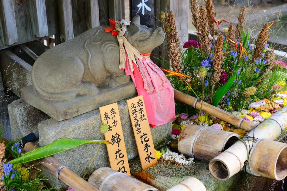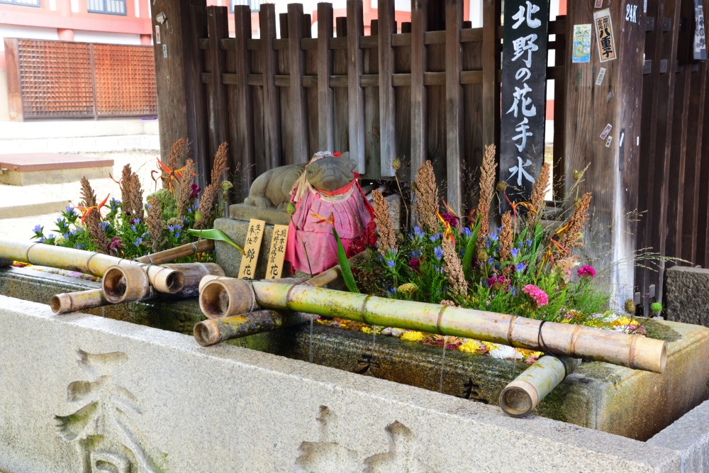 楼門をくぐって右手にあるのが「北野の花手水(はなてみず)」。コロナ禍の2020年頃から疫病退散と参拝客の心の慰みのために始まり、SNSを中心に話題に。季節の花々が美しく生けられ、心の安らぎを感じられます。