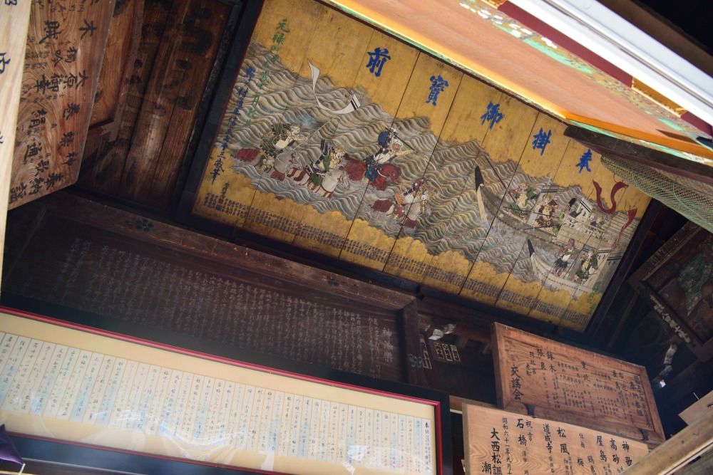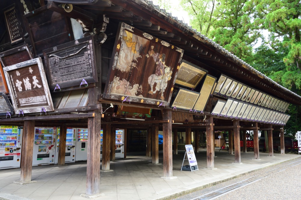 左手にある絵馬所は江戸時代の元禄12年(1699)に建てられたもので、規模・歴史ともに現存する絵馬所のなかでも随一。中に入って見上げてみると、北野天満宮に奉納した絵馬がいたる所に掲げられています。