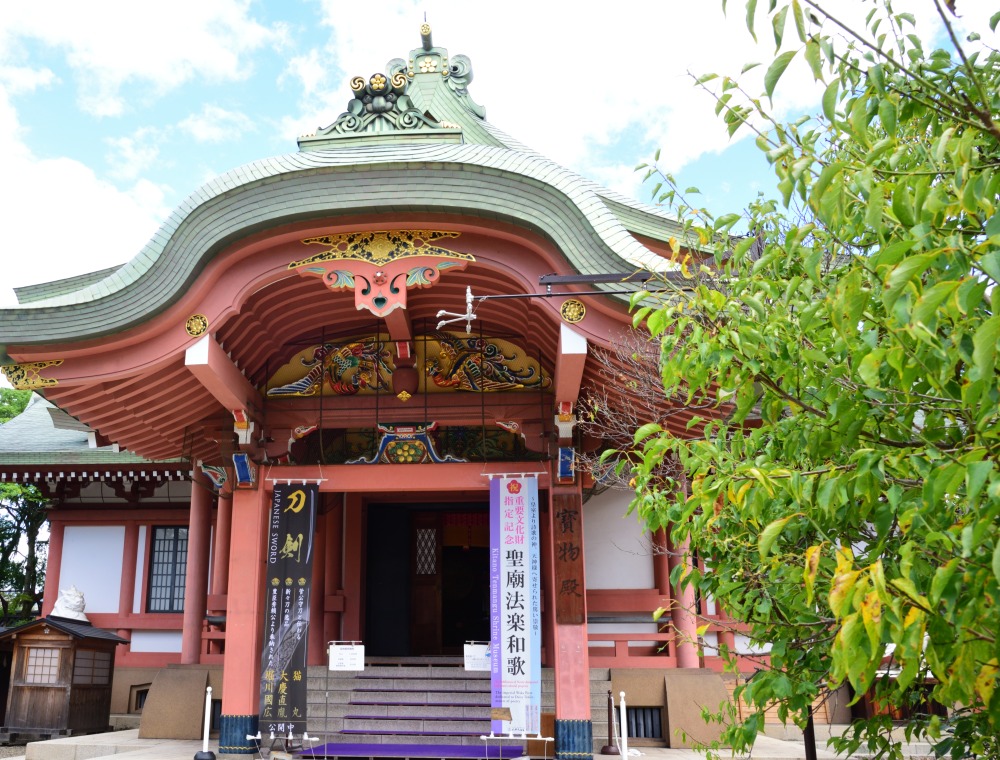 天神信仰ゆかりの神宝をじっくり観賞するなら、宝物殿を訪れてみてはいかがでしょう。国宝指定の「北野天神縁起絵巻」や、菅原道真公の守り刀と伝わる「猫丸」、新々刀(江戸時代後期から廃刀令までに作刀された日本刀)の銘品「大慶直胤(たいけいなおたね)」、豊臣秀頼が奉納した「堀川國広」などの名刀も展示され、刀剣ファンも数多く訪れます。