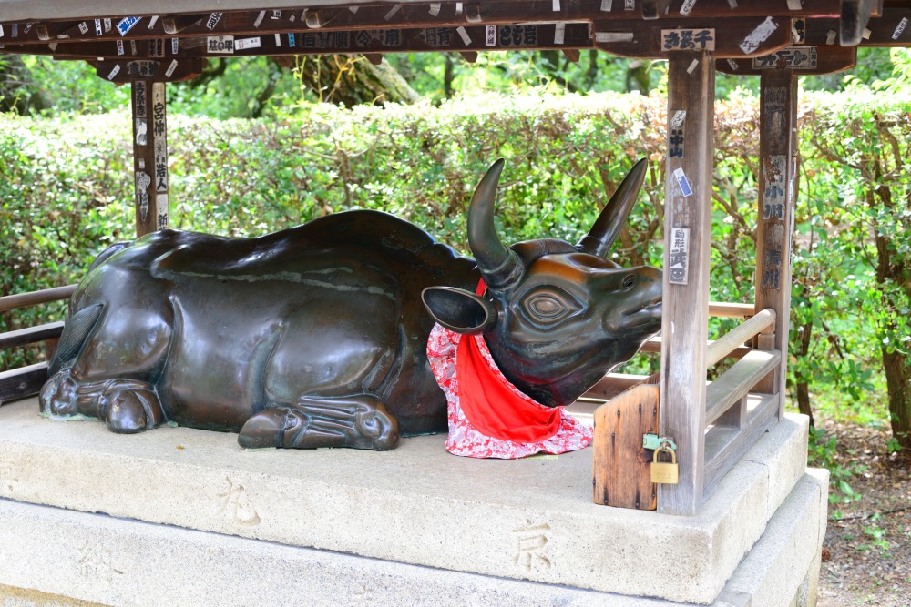 境内の北西にある一願成就所には、北野天満宮で最も古い牛の像が祀られ、こちらは「一願成就のお牛さま」とよばれています。よく見ると長年多くの人に撫でられたり風雨にさらされたりして、顔の一部が欠けていますね。牛を撫でた多くの人への思いも馳せながら、お願い事を託しましょう。